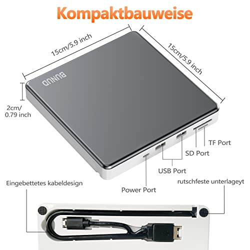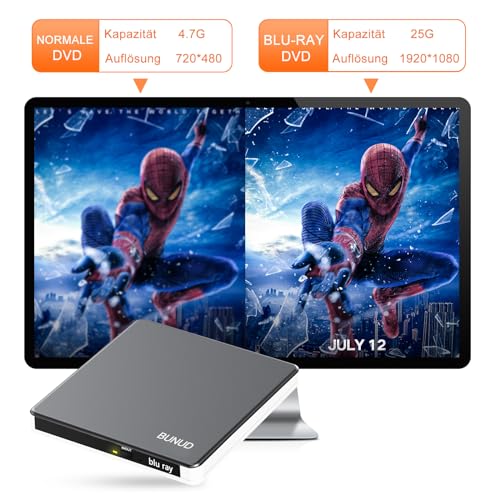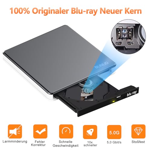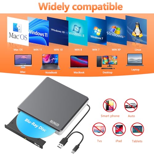 Plug and Play Ce lecteur blu ray externe utilise deux câbles différents, USB et Type-C. Il peut être facilement connecté à un ordinateur d’interface de type C ou USB 3.0, aucun pilote nécessaire, il suffit de le connecter à l’ordinateur et l’appareil sera bientôt détecté. Lecteur Blu-ray 5 en 1 Les lecteurs Blu-ray externes sont un lecteur 5 en 1 avec 2 ports USB et un emplacement SD/TF pour lire des fichiers/photos/vidéos entre votre ordinateur et un périphérique de stockage externe. 2 ports USB résolvent efficacement le problème des ports USB insuffisants. Large compatibilité Le lecteur Blu ray externe est idéal pour différents appareils, il est compatible avec ordinateur portable, ordinateur, système d’exploitation Windows et Mac OS, vous pouvez utiliser ce lecteur blu ray externe avec presque tous les ordinateurs, y compris MacBook Pro/Air, iMac, ordinateur portable Windows et PC de bureau. (Remarque : Le lecteur Blu ray ne joue pas de disques 4K Ultra HD) Lecteur Blu-ray multifonction Le lecteur CD DVD portable Blu ray est multifonctionnel et peut être utilisé pour lire des disques Blu-ray/CD/DVD, graver des disques Blu-ray/CD/DVD, lire de la musique, regarder des films, sauvegarder des données, installer des programmes et transférer des fichiers. Haute qualité Ce graveur Blu-ray est fabriqué en aluminium aéronautique et un nouveau noyau Blu-ray. Il dispose de fonctions parfaites telles que la réduction du bruit, la résistance aux chocs, la vitesse rapide, robuste et durable ainsi que la correction d’erreur..Portable à organiser Le lecteur blu ray externe est très léger, fin et facile à transporter et à ranger, de plus, vous n’avez pas à vous soucier de la perte de câbles avec la conception du câble intégré.