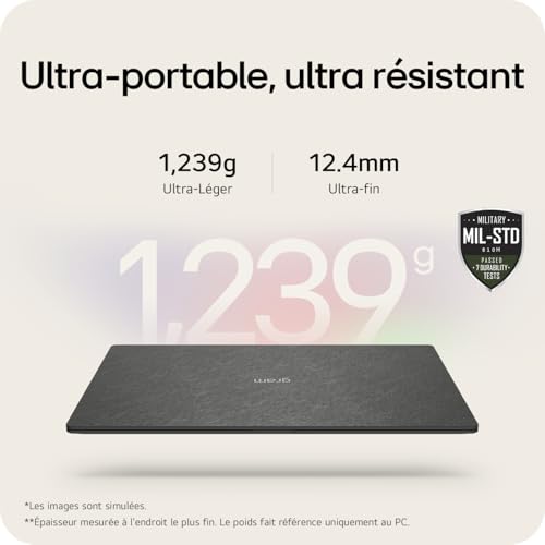 Design ultraléger de seulement 1,23kg, pensé pour les professionnels en mouvement. Profitez d’une expérience visuelle saisissante avec un PC portable 16” en haute résolution 16:10, couvrant 99 % du DCI-P3 pour des couleurs d’une précision remarquable. Processeur Intel Evo Ultra 7 256V associé à 16 Go de RAM, pour une performance fluide et réactive au quotidien. Stockage rapide et spacieux grâce au SSD NVMe de 1 To, idéal pour les fichiers lourds et le multitâche. Controleur Graphique Intel Arc et Windows 11 Home Next Gen. Premium, pour une expérience visuelle moderne et intuitive dans un élégant coloris Gris Métal.