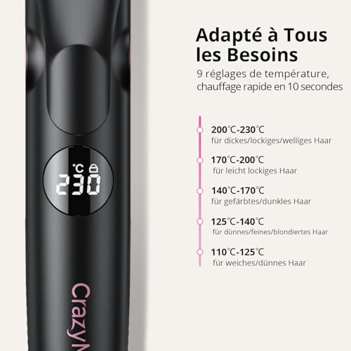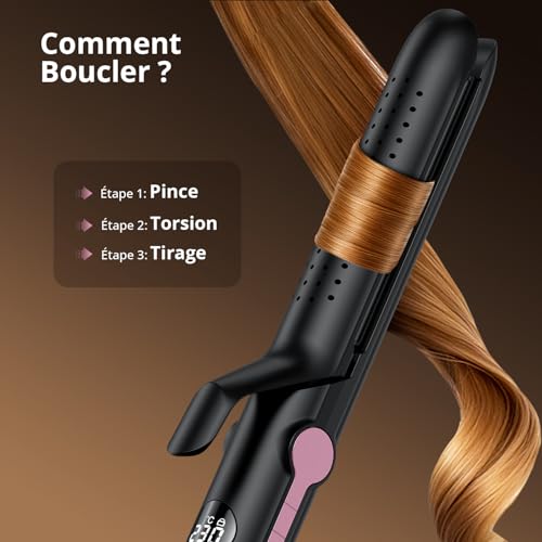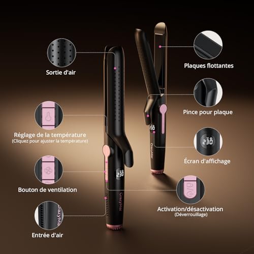 【2-en-1 Polyvalent】 Ce lisseur boucleur combine un fer à lisser et un fer à boucler en un seul appareil de coiffure, idéal pour créer des cheveux lisses parfaits ou des boucles définies en quelques minutes, sans changer d’outil. 【Outil de Coiffure Air Froide Intégrée】Ce fer à friser 2 en 1 avec fonction de vent froid, peut fixe instantanément votre style, réduire les dommages thermiques au cuir chevelu,réduit les frisottis et scelle les cuticules pour une brillance durable, parfaite pour les cheveux bouclés fragiles. 【Technologie Ions Négatifs】 Ce fer à lisser émet des ions négatifs pour neutraliser l’électricité statique, hydrater les cheveux et offrir une finition ultra-lisse et brillante avec chaque utilisation du lisseur diffuseur. 【9 Températures Personnalisables】Ce lisseur avec 9 niveaux de température (110°C à 230°C), adaptez le lisseur cheveux à tout type de cheveux (fins, épais, abîmés ou cheveux bouclés) pour un coiffage sans dommage. 【Sécurité Optimale】ce appareils et outils de coiffure mécanisme anti-erreur pour bloquer les réglages accidentels + surface anti-brûlure qui protège vos mains et le cuir chevelu, même à haute température. 【Design Portable】Ce fer à lisser/bigoudi est compact et léger. Cordon rotatif 360° pour un rangement facile, idéal pour les voyages ou le coiffage professionnel. 【Résultats Professionnels 】Parfait pour définir les boucles des cheveux bouclés, lisser les mèches rebelles ou créer des vagues beachy. Un outil de coiffure indispensable pour tous les styles !