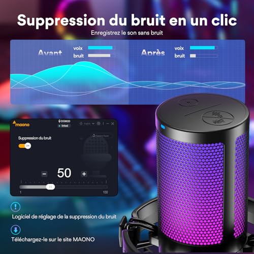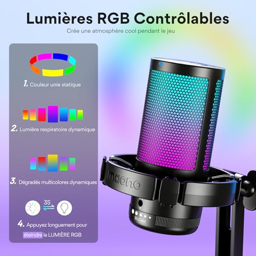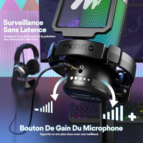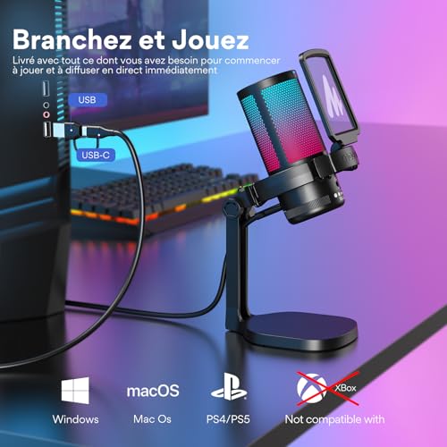 【Plus de Concentration et de Clarté】 Ce microphone usb utilise la technologie de réduction du bruit à une touche pour éliminer efficacement le bruit de fond. Le capteur cardioide se concentre davantage sur la capture du son provenant de l’avant du microphone, offrant une meilleure qualité sonore et une meilleure précision pour le streaming de jeux ou la voix. 【éclairage RGB Controlable】 Vous pouvez changer la couleur des lumières RGB en fonction de votre esthétique. Le micro gaming DGM20S dispose de 9 modes d’éclairage RGB personnalisés, et les effets d’éclairage doux et coordonnés font ressortir vos vidéos de jeu ou vos diffusions en direct de jeux. Appuyez longuement sur le bouton RGB pour éteindre la lumière RGB, appuyez brièvement pour allumer la lumière et régler la couleur de la lumière. 【Utilisation Multifonction Plus Facile】 Cliquez simplement sur le bouton muet en haut du micro pc pour activer le mode silencieux, utilisez le bouton de gain du microphone pour controler votre son en ligne, vous pouvez facilement controler l’audio de votre jeu et l’ajuster en conséquence. La surveillance sans latence facilite le maintien d’une qualité sonore professionnelle avec votre microphone gaming. 【Plug and Play】Microphone pc compatible avec Windows PC, ordinateur portable, Mac et PS4&5. Le microphone USB est toujours prêt à capturer votre inspiration. Branchez simplement le microphone directement sur votre ordinateur ou ordinateur portable à l’aide des cables USB et USB C inclus, et vous pouvez enregistrer ou diffuser instantanément, aucun pilote requis. (Remarque: non compatible avec XBOX) 【Kit Tout-En-Un】comprend 1 x microphone à condensateur, 1 x support stable, 1 x filtre anti-pop, 1 x support anti-choc, 1 x câble USB-C vers USB-A/USB-C, 1 x manuel d’utilisation, 1 x adaptateur de perche, Ce Micro Gaming peut être monté sur des pieds de microphone dotés de filetages de 5/8″ à 3/8″.