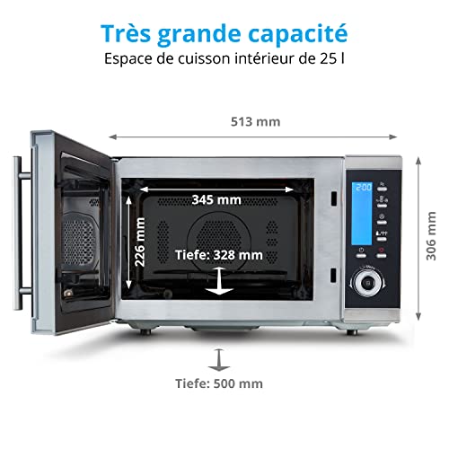 | Composants inclus | micro-onde 25L 4en1 MEDION avec fonction chaleur tournante, fonctions chaleur sole et chaleur voûte, plateau tournant en métal, grille cuisson en inox |