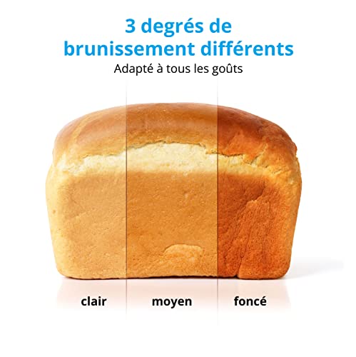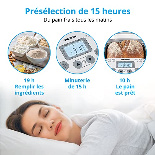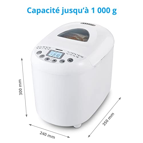 19 programmes automatiques : Ce robot pâtissier permet de faire du pain frais ainsi que de nombreuses autres recettes, comme de la confiture ou des yaourts maison. 3 modes de brunissage : Cet appareil électroménager permet d’obtenir un pain maison à la croûte blanche, légèrement ou très croquante en fonction de vos préférences. Préprogrammation de l’heure : Cette machine à pâtisserie dispose d’une option de démarrage différé de 15 heures, pour un pain encore chaud à déguster au petit-déjeuner. Idéal pour les personnes allergiques : la machine à pain maison vous permet de déterminer tous les ingrédients utilisés dans la recette, pour un pain frais sans additifs. Contenu de la livraison : machine à pain MD11011, 1 cuve à pain avec revêtement antiadhésif, 1x crochet de pétrissage, 1x cuillère doseuse, 1x gobelet mesureur, mode d’emploi et garantie.