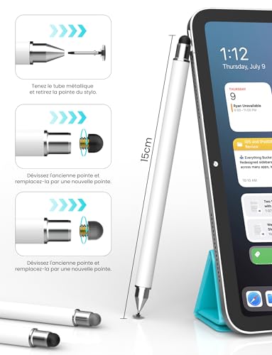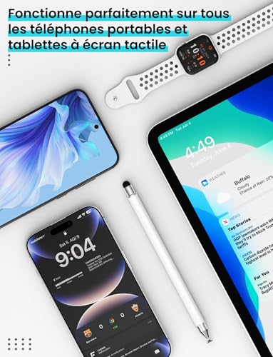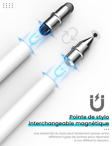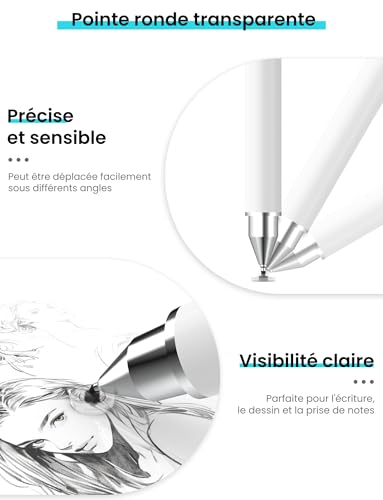 [Un stylet, trois embouts différents] Le stylet tactile MEKO est fourni avec trois embouts différents : un embout en caoutchouc, un embout en fibre et un embout disque, pour un excellent rapport qualité-prix. L’un des côtés de l’embout est magnétique, ce qui permet de changer facilement d’embout selon vos besoins. La conception magnétique assure également une fixation sûre de l’embout au stylet, garantissant une stabilité optimale lors de l’écriture et du coloriage, et empêchant l’embout de se détacher [Pointe transparente plus fine de 6 mm] L’autre extrémité du stylet est dotée d’une pointe améliorée de 6 mm, vous permettant de travailler avec précision sur votre téléphone ou votre tablette. C’est particulièrement utile pour les personnes ayant de grands doigts ou des difficultés de motricité fine lors de la saisie sur les petits claviers de smartphones. La pointe transparente vous permet de voir exactement où vous écrivez ou appuyez, et elle peut pivoter à 180 degrés, vous permettant d’écrire confortablement sous tous les angles [Utilisation tactile fluide] Les embouts en fibre et en caoutchouc du stylet pour smartphone offrent une sensibilité élevée, pour une précision accrue et une expérience d’écriture et de dessin naturelle. L’embout en caoutchouc remplace parfaitement vos doigts : il glisse sur l’écran sans le rayer ni laisser de traces de doigts, idéal pour sélectionner de petites icônes ou naviguer sur Internet. L’embout en fibre, quant à lui, est robuste, offre une sensation d’écriture fluide et une réactivité optimale, ce qui le rend idéal pour prendre des notes, dessiner et jouer [Compatibilité à 100%] Pas de batterie ni de Bluetooth. Ce stylet tablette est compatible avec tous les téléphones et tablettes à écran tactile comme iPhone/iPad/iWatch/Samsung/Huawei/Xiaomi/Microsoft Surface/Chromebook/Fire HD/Switch, etc [Le service MEKO] L’emballage contient 1 stylet pour tablette, 3 embouts en caoutchouc, 2 embouts en fibre et 2 embouts disque pour remplacer les embouts endommagés ou perdus. MEKO vous offre une garantie d’un an. Si vous n’êtes pas satisfait ou avez des questions, veuillez contacter l’équipe MEKO, et nous vous proposerons une solution satisfaisante