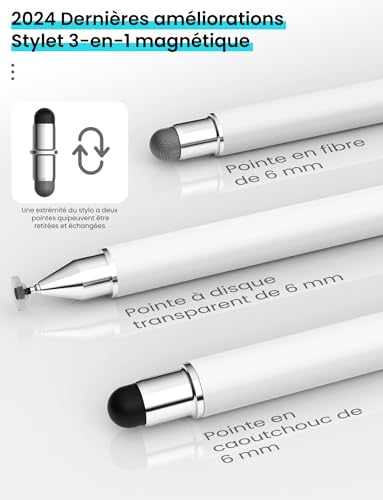 MEKO Stylet Tactile Magnétique 3 en 1 Stylet pour Tablette avec Embout en Fibre, Caoutchouc et Disque, Compatible avec Tous Les Tablettes/Téléphones comme iPhone/iPad/Samsung/Huawei/Xiaomi – Blanc