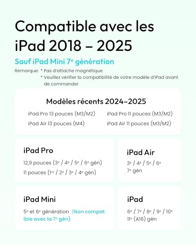 | Divers | NO compatible avec iPad modèles antérieurs à 2018, non compatible avec iPhone, Android ou appareils Microsoft., Non compatible avec l'iPad Mini 7., PAS de charge sans fil et PAS d'attraction magnétique |