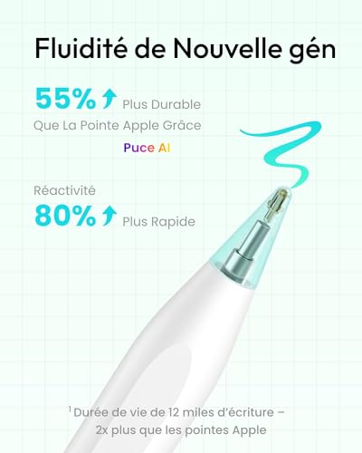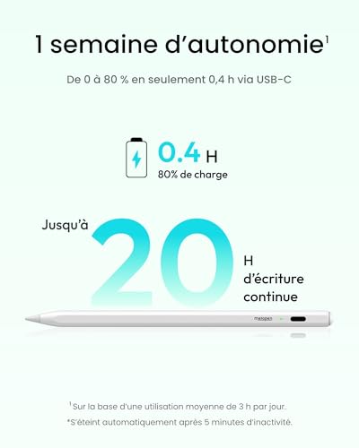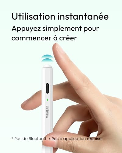 【Conçu pour l’iPad Pencil de 2018 à 2024】 Le stylet tactile pour Apple iPad est compatible avec les modèles avec iPad de la série 2018 à 2025 : pour iPad Air 11 pouces & 13 pouces (M2,M3), pour iPad Pro 11 pouces & 13 pouces (M4), pour iPad Mini 5/6 Gen, pour iPad 11(A16)/10/9/8/7/6 Gen, pour iPad Air 3/4/5 Gen,pour iPad Pro 11 pouces 1/2/3/4 Gen, pour iPad Pro 12.9 pouces 3/4/5/6 Gen. (𝑵𝑶𝑻𝑬 :Le Pencil pour ipad Air 8 n’est 𝑷𝑨𝑺 compatible avec iPad modèles antérieurs à 2018, non compatible avec iPhone, Android ou appareils Microsoft. Veuillez vérifier le modèle de votre produit avant de passer commande.)(𝑵𝒐𝒏 𝒄𝒐𝒎𝒑𝒂𝒕𝒊𝒃𝒍𝒆 𝒂𝒗𝒆𝒄 𝒍’𝒊𝑷𝒂𝒅 𝑴𝒊𝒏𝒊 7.) 【20H Autonomie longue & 2X Charge Rapide】 Ce pencil pour iPad Air 8 peut être complètement chargé en seulement 45 minutes avec USB-C et fonctionner jusqu’à 20 heures. Une charge de 2 minutes = 2 heures de travail.L’Air 8 vous apporte la plus longue autonomie de batterie de crayon sur le marché et la vitesse de charge la plus rapide. Vous n’avez plus à vous soucier de la batterie.(NOTE : Charge via un câble USB-C. 𝑷𝑨𝑺 𝒅𝒆 𝒄𝒉𝒂𝒓𝒈𝒆 𝒔𝒂𝒏𝒔 𝒇𝒊𝒍 𝒆𝒕 𝑷𝑨𝑺 𝒅’𝒂𝒕𝒕𝒓𝒂𝒄𝒕𝒊𝒐𝒏 𝒎𝒂𝒈𝒏é𝒕𝒊𝒒𝒖𝒆) 【Design ultra-léger & rejet de la paume】 Le stylet Metapen Air8 pour tablettes pèse seulement 10 grammes, soit 50% moins que l’Apple Pencil de 2ème génération. Sa conception légère est radicalement différente de la lourdeur des stylos capacitifs traditionnels, vous permettant de vous concentrer sur des heures d’écriture sans fatigue des mains. De plus, ce stylet pour iPad est doté d’une fonction de rejet de la paume qui permet à votre main de rester librement sur l’écran, vous permettant de créer sans interruption et de profiter d’une expérience d’écriture fluide similaire à celle sur papier. 【Facile à utiliser, affichage de la puissance LED】Cliquez une fois sur le bouton du haut pour allumer, appuyez de manière prolongée pour éteindre. Il suffit de le saisir et d’écrire. Aucune connexion Bluetooth nécessaire. Avec un indicateur LED à trois couleurs, soyez rassuré en connaissant le statut de la batterie. Arrêt automatique après 5 minutes d’inactivité pour une économie d’énergie efficace. 【Précision pixel à 0,1 mm, douceur sans délai】Le stylet pour apple ipad perpétue le puce améliorée de la famille Metapen, offrant une précision jusqu’à 0,1 mm au niveau du pixel. Aucun point d’arrêt et aucun délai. Vous pouvez profiter d’écrire de petits mots et de dessiner de fines lignes avec facilité, tout comme avec un crayon réel ! (NOTE : Le pencil Air 8 pour iPad n’a 𝒑𝒂𝒔 𝒅𝒆 𝒔𝒆𝒏𝒔𝒊𝒃𝒊𝒍𝒊𝒕é à 𝒍𝒂 𝒑𝒓𝒆𝒔𝒔𝒊𝒐𝒏 𝒆𝒕 à 𝒍’𝒊𝒏𝒄𝒍𝒊𝒏𝒂𝒊𝒔𝒐𝒏..) 【Même Pointe que l’Apple pencil】 Pointe de stylet polie pour éviter les rayures sur l’écran de iPad. Fabriquée en matériau polymère de haute qualité, elle est plus solide et plus durable que la pointe de l’stylo officiel d’origine, même lorsqu’elle est utilisée avec un film d’écran qui imite le papier. Chaque Metapen Stylet Air8 est livré avec 2 pointes de rechange supplémentaires, ce qui permet de réaliser des économies pour les utilisateurs de pointes à haute fréquence
