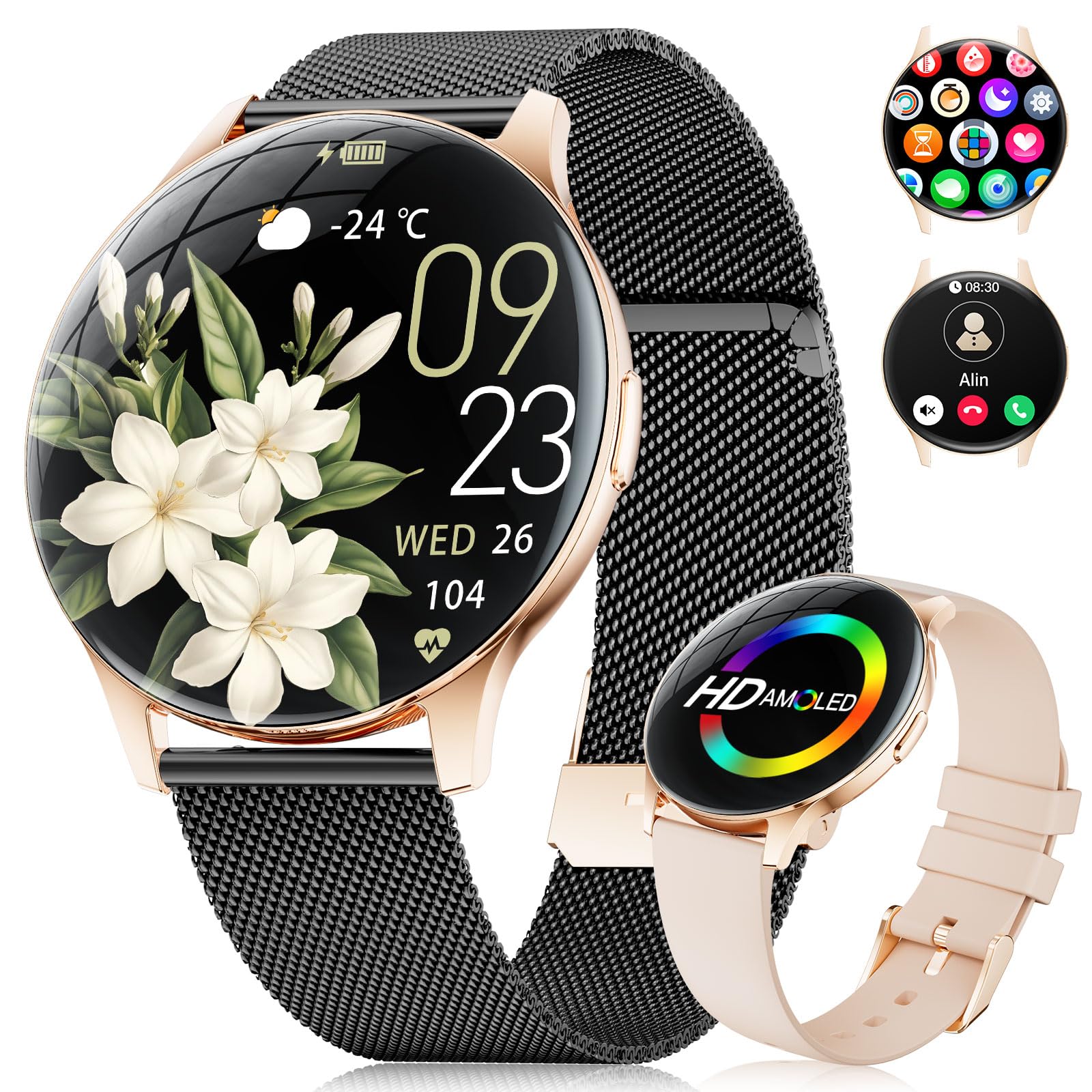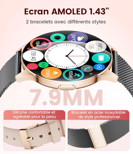 Montre Connectée Femme, 1,43″ AMOLED Écran/Appel Bluetooth/100+ Modes Sportifs Smartwatch, Sommeil/SpO2/Calories/Fréquence Cardiaque Moniteur pour Android iOS