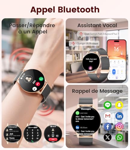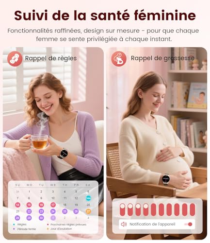 [Écran et boîtier élégants] Découvrez cette montre connectée femme au design épuré, équipée d’un sublime écran AMOLED HD de 1,43 pouces offrant une résolution exceptionnelle et des bords incurvés aux courbes élégamment arrondies. Son boîtier ultra-fin de seulement 7,9 mm sublime votre poignet, faisant de cette montre connectée femme un accessoire technologique aussi esthétique que fonctionnel – l’alliance parfaite entre innovation et élégance pour la montre connectée femme moderne exigeant précision et style. [Focus sur la santé des femmes] Spécialement conçue comme montre connectée femme, elle se concentre sur votre bien-être féminin avec un suivi scientifique précis du cycle menstruel et de la grossesse, des alertes personnalisées, et une surveillance 24h/24 de l’oxygène sanguin (SpO2), de la qualité du sommeil et de la fréquence cardiaque – cette montre connectée femme innovante devient votre compagnon santé intelligent. [Assistant sportif] Votre montre connectée femme devient votre coach sportif avec 100+ modes d’activités dynamiques pour le fitness en salle ou l’aventure en plein air – cette montre connectée femme enregistre avec précision chaque pas, la distance parcourue, le temps d’entraînement et les calories brûlées, transformant chaque effort en données motivantes grâce à la technologie intelligente de cette montre connectée femme conçue pour les sportives ambitieuses. [Centre de communication et assistant Ai] Transformez votre montre connectée femme en véritable centre de communication avec la fonction d’appel Bluetooth intégrée : passez des appels, consultez l’historique, gérez vos contacts, et recevez instantanément notifications SMS, réseaux sociaux et applications sur cette montre connectée femme intelligente. Son assistant vocal réactif devient votre allié quotidien pour gérer alarmes, consulter la météo ou contacter vos proches – la montre connectée femme ultime qui simplifie votre vie connectée tout en restant élégante à votre poignet. [Personnalisation] Personnalisez votre montre connectée femme avec plus de 200 cadrans uniques et transformez vos photos préférées en fond d’écran personnalisé – cette montre connectée femme innovante inclut deux bracelets interchangeables étanches (acier inoxydable élégant + silicone sportif) pour adapter son style à chaque moment, faisant de cette montre connectée femme votre compagnon quotidien aussi versatile qu’élégant. [Explorez davantage] Découvrez la polyvision fonctionnelle de cette montre connectée femme : rappels anti-sédentarité intelligents, alertes d’hydratation personnalisées, déclencheur photo à distance pratique, contrôle musical intuitif, calculatrice intégrée, monitoring du stress et agenda numérique synchronisé – chaque détail de cette montre connectée femme ingénieuse orchestre votre quotidien avec une élégante efficacité, transformant votre poignet en véritable poste de commande connecté.