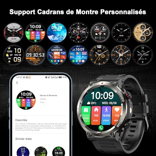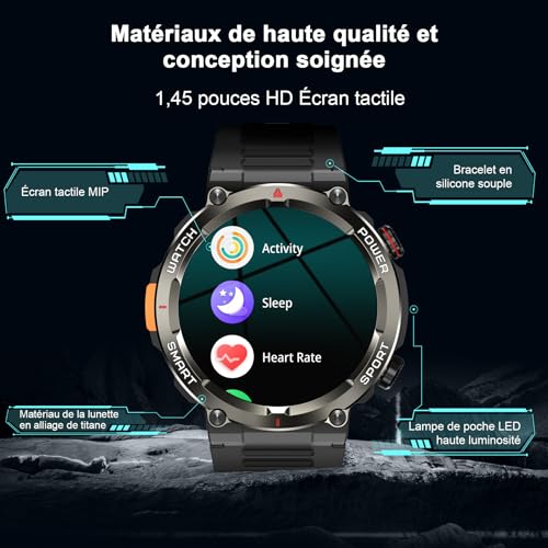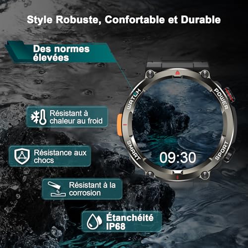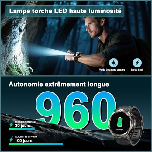 ⚔️【Triple protection militaire】Incassable même dans des conditions extrêmes. Conforme aux tests de certification militaire MIL-STD-810H : 12 tests de chute de 1,5 mètre + test de corrosion au brouillard salin (-30 °C à 70 °C). Boîtier en alliage de zinc et bracelet certifié FSC pour une double protection. Indice d’étanchéité IP68 (1,5 mètre pendant 30 minutes) : protège contre la poussière de chantier, la pluie en montagne et les missions de survie. Idéal pour les artisans et les aventuriers de l’extrême. 🧭【Ensemble tactique d’extérieur : lampe torche LED, boussole et 2 sangles】Lampe torche LED intégrée à 5 intensités (0,5 W/portée de 10 m) avec mode stroboscopique pour une utilisation nocturne en cas d’urgence. La boussole précise à calibrage automatique pénètre le brouillard en montagne et les sous-bois. Comprend deux bracelets tactiques : un bracelet en silicone respirant pour le sport et un bracelet en nylon indéchirable pour la randonnée. ⚡ 【Batterie grande capacité 960 mAh : 100 jours d’autonomie en veille】La batterie de 960 mAh surpasse de loin celle des montres standard (360 mAh) : 20 jours de fonctionnement complet (appels/suivi d’activité) ou 100 jours en veille. Testée pour 720 heures de fonctionnement continu à -20 °C, elle est parfaite pour les randonnées de plusieurs jours sans alimentation. Plus besoin de se soucier de la charge ! 📱【Écran Smart Command de 1,45 pouce】Cette montre connectée reste connectée même en cas de tempête : l’écran HD de 1,45 pouce (320 x 280 pixels) avec verre antireflet est parfaitement lisible, même en plein soleil ou pendant les quarts de nuit. Cadrans riches et variés : Plus de 220 cadrans préinstallés et des designs personnalisables ! La connectivité Bluetooth 5.3 et le microphone antibruit à 360° garantissent des appels sans interruption, même par vent jusqu’à 30 km/h. Notifications en temps réel pour WhatsApp, SMS et appels (Android/iOS). ❤️【Suivi de la santé 24h/24 et 7j/7 et plus de 120 modes sportifs】Cette montre connectée sport pour homme utilise un capteur de troisième génération pour mesurer la fréquence cardiaque et la saturation en oxygène du sang en temps réel et analyser les phases de sommeil (sommeil profond et sommeil léger). Plus de 120 modes sportifs pour la randonnée, le vélo et l’escalade suivent la distance, les calories et les itinéraires. Votre coach sportif personnel ! 👍【Résumé des fonctions de rappel + compatibilité】Après avoir terminé les réglages pertinents, la montre intelligente sonnera et vibrera pour vous rappeler : rester assis longtemps, boire de l’eau, se laver les mains, atteindre un objectif, batterie faible, alarme, chronomètre, minuterie, etc. La montre de sport est également compatible avec les smartphones tels que iPhone, Huawei, Samsung et Xiaomi (Android 6.0+ et iOS 9.0+).