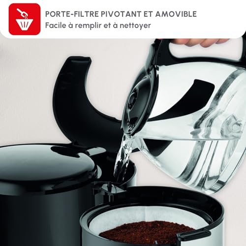 CAFETIÈRE FILTRE AVEC CARAFE EN VERRE 1,25 L : Grande capacité 10-15 tasses et maintien au chaud 30 min avec une plaque chauffante qui garde le café à température idéale, parfaite pour les familles ou les matinées chargées. SERVICE À TOUT MOMENT GRÂCE À LA FONCTION STOP-GOUTTE : Retirez la carafe sans attendre la fin du cycle, sans risque de taches ni de gouttes sur la plaque. UTILISATION SIMPLE ET INTUITIVE : Bouton marche/arrêt lumineux, porte-filtre pivotant facile d’accès, et remplissage facile du réservoir. DESIGN COMPACT ET ÉLÉGANT : Finitions inox brossé modernes pour s’intégrer dans toutes les cuisines, même les plus petites. ENTRETIEN FACILE AU QUOTIDIEN : Porte-filtre amovible et verseuse compatibles lave-vaisselle pour un nettoyage sans contrainte. SÉCURITÉ RENFORCÉE ET ÉCONOMIE D’ÉNERGIE : Arrêt automatique après 30 minutes pour une utilisation sans stress.
