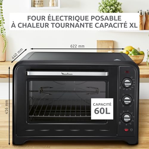 Moulinex Four électrique à chaleur tournante 60 L, 7 modes de cuisson, Tournebroche, Thermostat réglable jusqu’à 240 °C, Timer 120 minutes, 2 grilles réversibles, Optimo, Noir OX495810