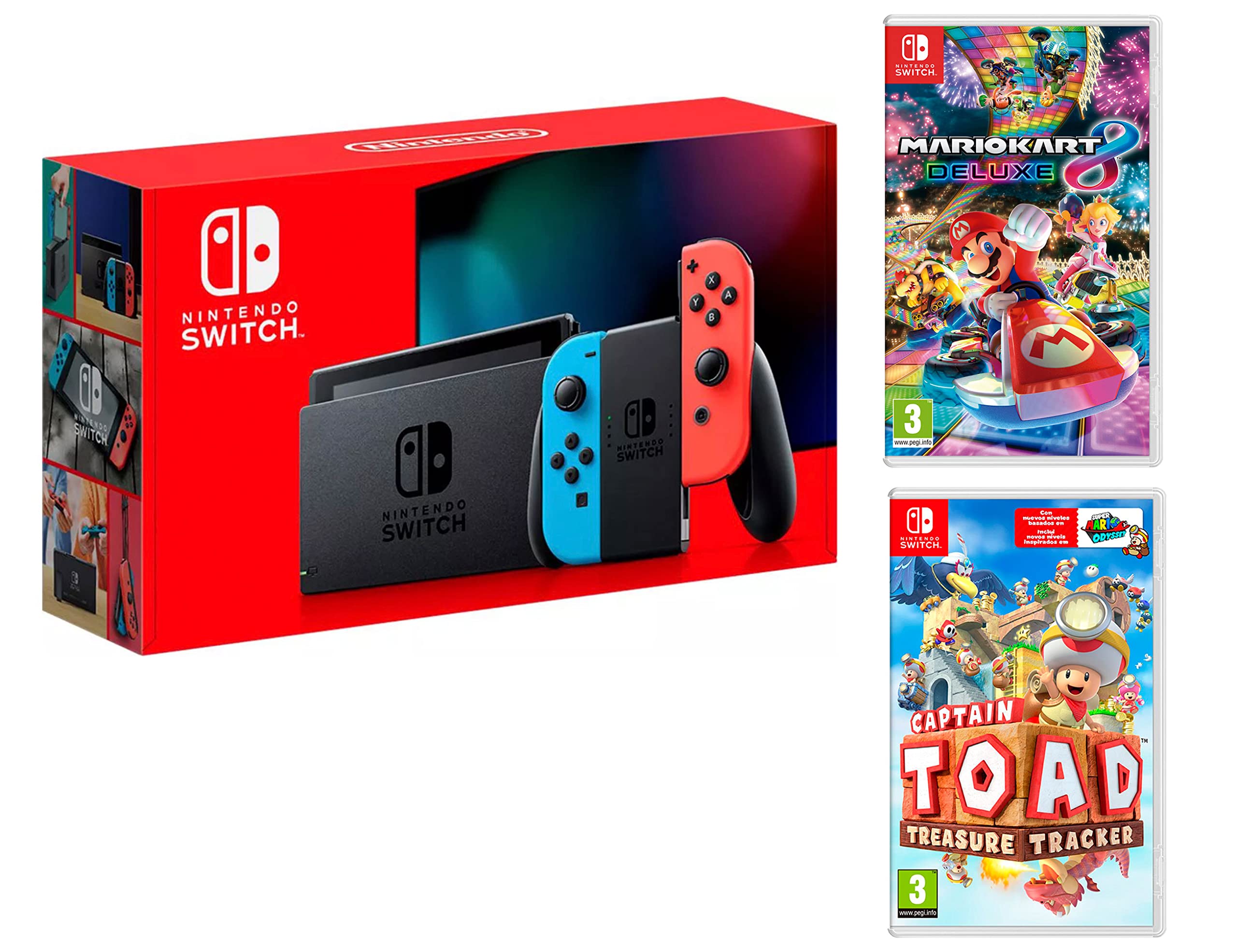 Console Nintendo Switch 32Gb + Manette Joy-Con droite/gauche, support Joy-Con station d’accueil Nintendo Switch un câble HDMI, un adaptateur secteur Nintendo Switch – Une paire de dragonnes Joy-Con inclus: Captain Toad: Treasure Tracker + Mario Kart 8 Deluxe Langues de voix et de textes 100% Français (boîte et manuel en langue anglais/espagnol dépend de la disponibilité)