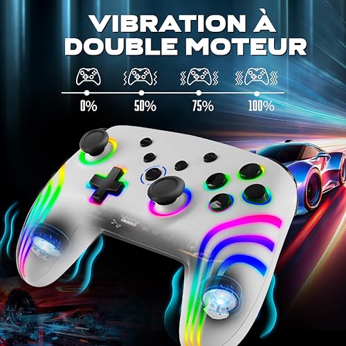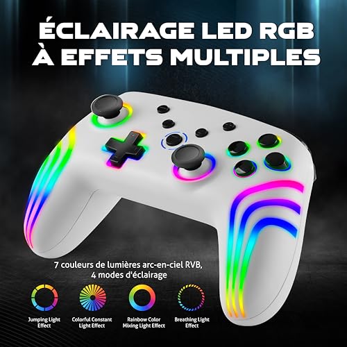 NITHO NEXUS Manette Sans Fil Compatible avec Switch/Switch 2/PC/Android/iOS, Gamepad avec Gyroscope 6 Axes, Double Vibration, Turbo, LED RGB, Joystick Ergonomique – Blanc