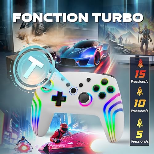 Compatibilité: La NiTHO NEXUS manette Switch sans Fil est entièrement compatible avec les appareils Switch/Switch 2/Lite/OLED/PC/Android/iOS. Remarque: La première connexion au PC nécessite un appariement via le dongle inclus. L’utilisation ultérieure sera sans fil Vibration et Gyroscope 6 Axes: Améliorez votre jeu grâce à 4 niveaux de vibration réglables (désactivé, faible, moyen, élevé) et à un gyroscope 6 axes à haute sensibilité pour détecter les mouvements, les inclinaisons et les rotations avec précision Fonction Turbo Réglable: Optimisez votre expérience de jeu grâce à la fonction turbo personnalisable et à la fonction turbo automatique, idéales pour les actions rapides ou répétitives. Choisissez entre 3 vitesses (5, 10 ou 15 pressions par seconde) et désactivez le turbo lorsque vous n’en avez pas besoin Design Ergonomique avec Éclairage LED RGB: Léger et confortable, avec des effets lumineux RGB personnalisables. Les gâchettes à effet Hall de haute précision garantissent un meilleur contrôle et un plus grand réalisme pendant le jeu Batterie et Chargement: La batterie intégrée haute capacité offre jusqu’à 9 heures de jeu. Charge complète en 2,5 à 3 heures via le câble USB-C inclus Remarque: La touche “HOME” de cette manette ne peut pas réveiller la console Switch 2, et il n’y a pas de touche C pour le chat vocal. Cependant, toutes les autres fonctions fonctionnent normalement, y compris la double vibration, le gyroscope à six axes, les boutons à effet Hall et la fonction Turbo