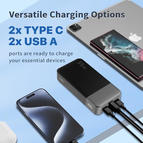 【Chargement Super Rapide de 35 W】High speed portable phone charger with advanced PD 3.0 and QC 4.0 Protocol, fuel your Phone 16 from 0 to 61% or a S22 ultra from 0 to 40.9% in just 30 minutes 【Charge Rapide Bidirectionnelle】Un câble C à C est inclus pour une charge rapide bidirectionnelle pratique, permettant au banc d’alimentation portable de se charger en seulement 1,4 heure, et de charger l’Phone 16 en seulement 2 heures. Pas besoin d’attendre longtemps, rétablir rapidement l’alimentation à tout moment, n’importe où, de sorte que vous pouvez facilement faire face à votre emploi du temps chargé, ne pas manquer chaque moment important 【4 Sorties & 2 Entrées】Equipé de 2 ports de sortie USB A et de 2 ports de type C (tous deux prenant en charge l’entrée et la sortie), ce power bank vous permet de charger jusqu’à 4 appareils en même temps. Que vous partagiez l’alimentation avec d’autres personnes ou que vous gardiez plusieurs appareils chargés, il offre une charge pratique et efficace sans attente 【Mode Faible Courant】Le banc d’alimentation charge efficacement les appareils standard et prolonge la durée de vie de la batterie des gadgets plus petits. Appuyez deux fois sur le bouton d’alimentation pour activer le mode de charge lente, indiqué par une lumière LED en boucle. Ce mode assure la protection et la longévité des petits appareils tels que les écouteurs Bluetooth et les smartwatches 【Sécurité & longévité】Le chargeur portable est certifié pour garantir la conformité à des normes de sécurité fiables et est approuvé par les compagnies aériennes. La protection intégrée contre la surcharge, la surtension, la surintensité, le court-circuit et la surchauffe vous permet de charger vos appareils en toute confiance 【Universellement Compatible Tous les Appareils】Qu’il s’agisse d’un appareil à forte puissance ou d’un appareil dont les besoins en courant sont moindres, notre chargeur portable s’adapte à tous. Smartphones, tablettes, ordinateurs portables, oreillettes sans fil, smartwatches, drones – il fonctionne avec tous ces appareils