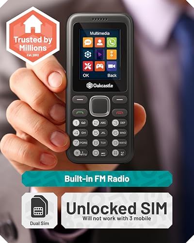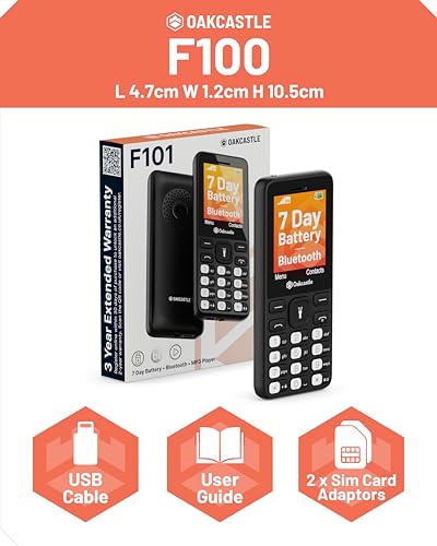 𝗧É𝗟É𝗣𝗛𝗢𝗡𝗘 𝗗É𝗕𝗟𝗢𝗤𝗨É 𝗔𝗩𝗘𝗖 𝗗𝗢𝗨𝗕𝗟𝗘 𝗖𝗔𝗥𝗧𝗘 𝗦𝗜𝗠: Le dumb phone Oakcastle F100 est le téléphone de secours, d’urgence ou de festival idéal, avec une batterie ultra longue durée. Ajoutez simplement une carte SIM prépayée de base (ou 2 cartes SIM pour un usage professionnel et personnel). 𝗗𝗨𝗥𝗔𝗕𝗜𝗟𝗜𝗧É, 𝗕𝗟𝗨𝗘𝗧𝗢𝗢𝗧𝗛, 𝗠𝗨𝗟𝗧𝗜𝗠É𝗗𝗜𝗔 : Doté d’un Bluetooth intégré pour le transfert de fichiers, d’un lecteur de musique et d’une prise casque, d’un visualiseur de photos et de vidéos, le téléphone portable pas cher Oakcastle F100 est doté de toutes les fonctionnalités d’un téléphone portable classique et durable. Compatible avec les cartes micro-SD jusqu’à 32 Go pour le stockage multimédia. 𝗙𝗢𝗡𝗖𝗧𝗜𝗢𝗡𝗡𝗔𝗟𝗜𝗧É, 𝗔𝗨𝗧𝗢𝗡𝗢𝗠𝗜𝗘 𝗗𝗘 𝗟𝗔 𝗕𝗔𝗧𝗧𝗘𝗥𝗜𝗘 𝗗𝗘 𝟱 𝗝𝗢𝗨𝗥𝗦: Téléphone portable basique, parfait et facile à utiliser, l’Oakcastle telephone portable sans internet F100 vous permet de passer des appels et d’envoyer des SMS et d’organiser vos contacts sans effort. La batterie du F100 dure 5 jours en veille et 5 heures en appels. 𝗖𝗔𝗥𝗔𝗖𝗧É𝗥𝗜𝗦𝗧𝗜𝗤𝗨𝗘𝗦 𝗦𝗨𝗣𝗣𝗟É𝗠𝗘𝗡𝗧𝗔𝗜𝗥𝗘𝗦: Le petit telephone portable touche Oakcastle F100 est également doté de fonctionnalités supplémentaires, notamment une radio FM, un enregistreur vocal, un calendrier, une torche LED et est également préchargé avec des jeux classiques comme Doodle Jump et Crossy Road. 𝗖𝗘 𝗤𝗨𝗘 𝗖𝗢𝗡𝗧𝗜𝗘𝗡𝗧 𝗟𝗔 𝗕𝗢Î𝗧𝗘: Contenu du colis : telephone a touche F100, manuel d’utilisation, 2 adaptateurs de carte SIM (micro et nano), câble de chargement USB. Dimensions du produit : 10,5 x 4,7 x 1,2 cm. Poids du produit : 70 grammes.