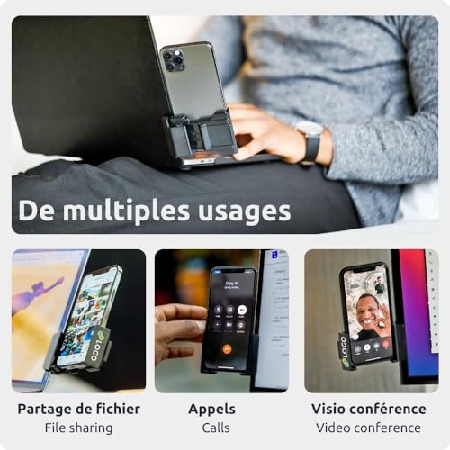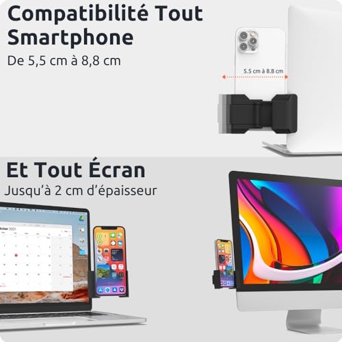 🇫🇷【Concept made in France】Développé par une startup française et récompensé au concours Lépine. Phoneside support téléphone pour ordinateur vous permet de clipser votre smartphone à votre ordinateur en toute sécurité et être ainsi plus productif au travail comme à la maison. 💎【Simple et pratique】Le support de téléphone pour écran d’ordinateur dispose d’une pince en caoutchouc sécurisée qui offre un confort d’utilisation mains libres et un angle de vision confortable. Emplacement libre pour charger votre smartphone lorsque vous êtes en télétravail ou en visioconférence. ✅【Sécurité pour votre écran】 Contrairement aux autres supports pour ordinateurs portables, Phoneside est doté d’une pince qui permet une accrouche souple du support. Rien à coller que ça soit sur votre ordinateur ou sur votre téléphone. 📱【Compatibilité Smartphone】La plupart des téléphones portables existants: Phoneside compatible pour iPhone XS, iPhone 12 Mini, 12 Pro Max, 11 Pro, XS Max, iPhone XR, iPhone X 8 plus 7 7 plus 6 6 plus 6s 6s plus, Google Pixel, Nexus, Switch, Samsung Galaxy S10 S9 S8 S6, Note 8 et + Huawei et d’autres téléphones portables Android. (MacBook Air + iPhone Pro Max : risque de mauvaise tenue) 💻【Compatibilité Écran d’ordinateur】Phoneside Support de Téléphone Portable est compatible avec les écrans d’ordinateurs portable et fixe allant jusqu’à 2 cm d’épaisseur. MacBook Air / Pro, Google Pixelbook, Dell XPS, HP, ASUS, ThinkPad, Acer, Chromebook, Microsoft Surface, iPad, ect. (MacBook Air + iPhone Pro Max : risque de mauvaise tenue)