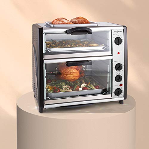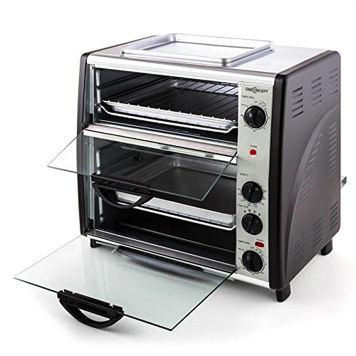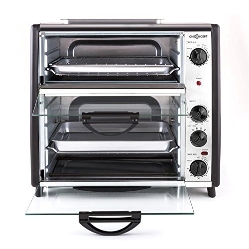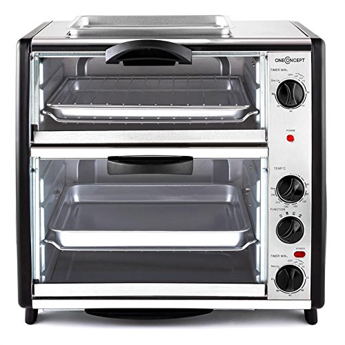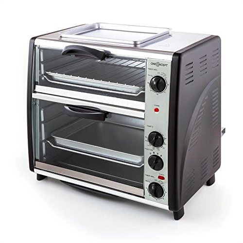 VERSATILITÉ: Grâce à ses deux espaces de cuisson séparés, le four permet de préparer des plats complets. Poulet, gratin, légumes et patates au four, laissez vos idées prendre forme et goût avec le four double All-You-Can-Eat. PUISSANCE: Avec ses 2400W de puissance, le mini four vous permet de préparer tous vos repas très facilement. La minuterie peut s’étendre jusqu’à 60 minutes. Un signal sonore vous indique lorsque le travail de cuisson est accompli. PLUS QU’UN FOUR: En plus des grilles et des plaques, un tourne-broche fait aussi partie de la livraison pour la cuisson du poulet. Le dessus du four double vous surprendra, un accessoire spécial permettra de l’utiliser comme grill barbecue. MULTI-TÂCHES: Pour la préparation quotidienne de vos repas, dans votre cabane de jardin, les soirées entre amis, le All-You-Can-Eat de oneConcept fait toujours bonne figure avec son grand vitrage et ses deux témoins LED. THERMOSTAT RÉGLABLE: Avec le four All-You-Can-Eat vous pourrez régler facilement le temps et la température de cuisson de vos plats. Le four avec une capacité totale de 42 litres met à votre disposition des températures comprises entre 60 et 240°C.