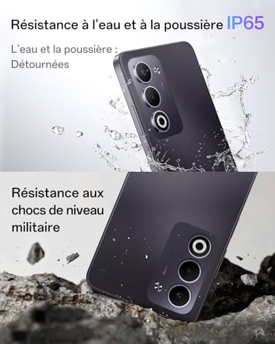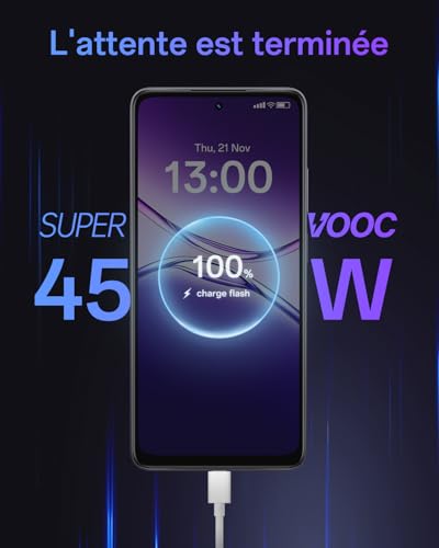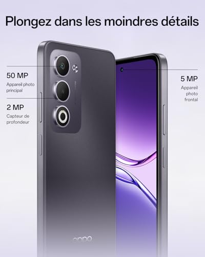 【Appareil photo 50 Mpx avec IA】Les technologies AI Eraser 2.0, AI Unblur et AI Smart Image Matting 2.0 éliminent les éléments gênants, corrigent le flou de mouvement et découpent proprement tout ce qui vous dérange, vous aidant ainsi à capturer des moments nets et précis lors de concerts, pendant vos voyages ou pour les partager sur les réseaux sociaux. 【Batterie 6000 mAh + recharge rapide SUPERVOOC 45 W】 Une structure repensée améliore l’efficacité, permettant une recharge plus rapide et une réduction de la chaleur. Conçue pour cinq ans de service fiable, elle conserve 80 % de sa capacité d’origine. Atteignez 50 % en un peu plus d’une demi-heure, parfait pour recharger votre appareil pendant que vous déjeunez. 【Écran 90 Hz + amplification du volume de 300 %】 L’écran HD+ de 6,67 pouces avec un taux de rafraîchissement de 90 Hz offre des images exceptionnellement fluides pour les vidéos, les films et les jeux. La technologie d’amplification du volume de 300 % garantit un son cristallin sans casque, vous permettant de profiter de l’audio à tout moment et en tout lieu. 【IP65 + résistance aux chocs de niveau militaire】 Testé selon la norme IP65, avec une étanchéité de précision, cet appareil résiste à la poussière et à l’eau. Certifié selon les normes militaires et classé SGS Gold, il est conçu pour résister facilement aux chocs, aux coups et aux accidents de la vie quotidienne. 【Processeur Snapdragon 6s 4G Gen1】Le processeur amélioré offre des performances quotidiennes plus fluides et une réponse plus rapide des applications, vous offrant une puissance fiable pour tout, du streaming au défilement.