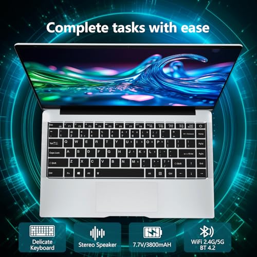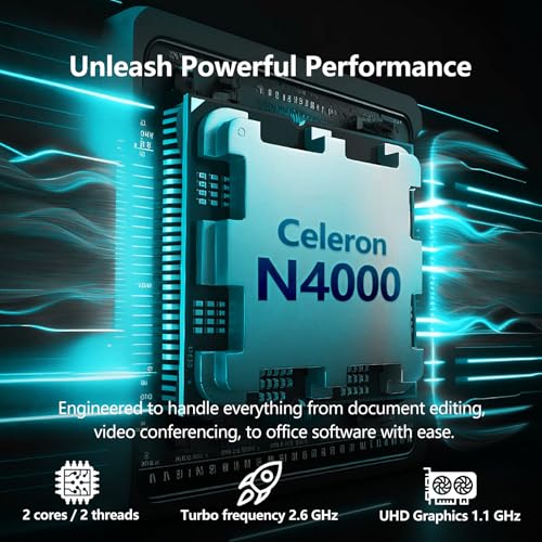 【Le processeur Celeron N4000 offre des performances optimales】Cet ordinateur portable est équipé d’un processeur Celeron N4000 avec une fréquence de base de 1,2 GHz (4 Mo de cache, jusqu’à 2,60 GHz) et d’une carte graphique UHD Graphics 600 de 9e génération, capable de gérer efficacement les tâches quotidiennes telles que la navigation, le streaming et la bureautique, garantissant des performances fiables et sans latence. Le puissant système d’exploitation Win 11 Pro assure un multitâche plus rapide et un fonctionnement fluide selon les besoins. Il est idéal pour travailler, étudier ou se divertir en déplacement. 【Fin et léger de 14,1 pouces, design pivotant à 180°】Cet ordinateur portable 14,1 pouces 16:9 est équipé d’un écran haute résolution 1366 x 768, d’un grand angle de vision de 178° et d’un cadre plus fin, pour des couleurs vives et naturelles. Il est également équipé d’une caméra frontale de 30 W, idéale pour l’enseignement et les visioconférences à distance, pour une meilleure communication et interaction. De plus, sa charnière pivotant à 180° offre des angles de vision flexibles, parfaits pour les présentations, le partage de contenu ou la saisie confortable dans différentes postures. Le mode nuit et les réglages de couleur de l’écran contribuent à réduire la fatigue oculaire. 【RAM LPDDR4 + SSD M.2】Cet ordinateur portable de 14,1 pouces est équipé de 6 Go de RAM LPDDR4 et d’un disque dur SSD de 256 Go, ce qui lui permet de démarrer rapidement les applications, de réagir plus vite et de naviguer sur le Web plus facilement. De plus, vous pouvez étendre l’espace de stockage grâce à la prise en charge d’une carte TF pour créer et stocker davantage de fichiers. Cet ordinateur portable est particulièrement adapté aux bureaux et aux études. Avec un poids de seulement 1,25 kg et un design ultra-fin, il est à la fois élégant et portable. 【Conception riche en ports】cet ordinateur portable est conçu pour la portabilité. Il est équipé de nombreux ports, dont 2 ports USB 3.0, 1 port Micro SD, 1 port Mini-HDMI et un port d’alimentation CC 3,5 mm. Il prend en charge le Wi-Fi double bande 2,4G/5G. Idéal pour connecter plusieurs périphériques, il offre une grande flexibilité pour le travail et les loisirs. Cet ordinateur portable Win 11 est également équipé d’une batterie grande capacité de 5000 mAh, prend en charge l’ouverture et la fermeture à 180° et permet un partage illimité. Son format compact de 32,2 x 20,8 x 1,7 cm le rend facile à transporter, que vous soyez en voyage, en télétravail ou à l’école. 【Garantie et assistance de 3 ans sans souci】En cas de problème avec votre ordinateur portable, notre service client professionnel vous assistera rapidement et vous proposera des solutions pour que vous puissiez travailler ou jouer sans interruption. Cet ordinateur portable de 14,1 pouces est équipé d’un clavier QWERTY et est fourni avec des films de protection de clavier disponibles en plusieurs langues (français, italien, espagnol, allemand). 【Remarque : La langue d’origine de l’ordinateur portable est l’anglais. Après la mise sous tension, vous pouvez définir la langue du système dans les paramètres système et utiliser le film de protection du clavier dans la langue souhaitée. 】
