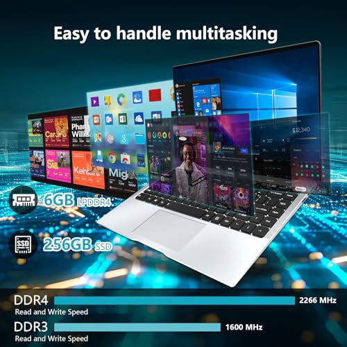 Ordinateur Portable 14,1 Pouces, PC Portable SSD 256 Go RAM 6 Go processeur Celeron N4000, Laptop écran 180°, Mini-HDMI, 2 Ports USB 3.0, Batterie 5000 mAh, Argent, Fin et léger