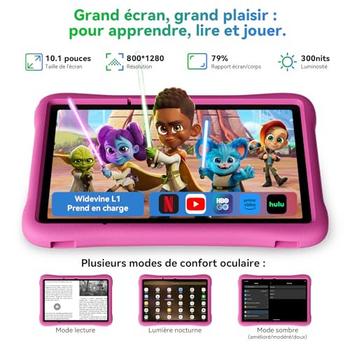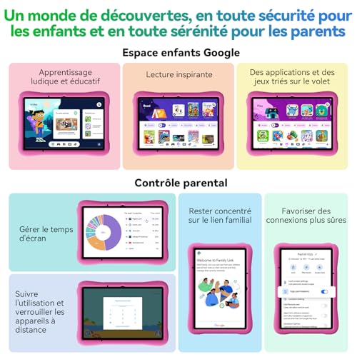 | Divers | 10 pouces avec trois modes de protection oculaire et processeur octa-core 12 Go + 128 Go de ROM Android 15 et 5000 mAh et contrôle parental |