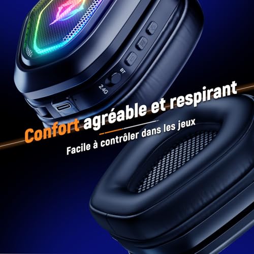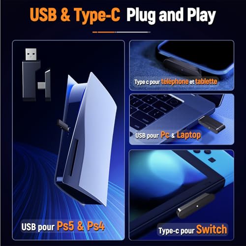 🎧 Audio Professionnel Puissant : Équipé de haut-parleurs de 50 mm haute précision pour une sensibilité accrue et un son stéréo surround 3D immersif. Le micro omnidirectionnel est parfaitement calibré pour une clarté vocale exceptionnelle, sans bruit de fond parasite, idéal pour les jeux et les communications 🎧 Liberté Sans Fil Totale : Profitez d’une autonomie impressionnante de 40 heures (à 60% du volume) et d’une transmission audio sans fil 2,4G avec une portée de 10 mètres. Parfait pour une utilisation sur Ps5, Ps4, PC et appareils mobiles, avec une qualité stéréo inégalée 🎧 Connexion à Faible Latence : Bénéficiez d’une connexion sans fil 2,4GHz à faible latence (<30 ms) pour un son haute fidélité parfaitement synchronisé avec l'image, permettant des réactions rapides et précises lors des sessions de jeu intenses 🎧 Confort Supérieur : Design ergonomique avec bandeau réglable et coussinets en mousse à mémoire de forme pour un confort optimal, même lors de longues sessions. L'éclairage RGB ajoute une touche stylée à votre setup de jeu 🎧 Compatibilité Multiplateforme : Plug & Play sans besoin de pilotes ou téléchargements. Compatible avec Ps4, Ps5, PC, appareils mobiles en mode 2,4G, et avec Mac, ordinateurs portables en mode Bluetooth 🎧 Remarque Importante : 1. Pour connecter à une Ps5/Ps4/PC/Laptop, l'émetteur 2-en-1 doit être utilisé 2. Le mode sans fil n'est pas compatible avec tous les appareils Xbox 3. Le mode Bluetooth n'est pas compatible avec PS4/PS5 4. Le microphone n'est pas fonctionnel avec la Nintendo Switch