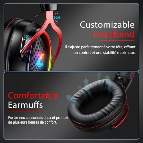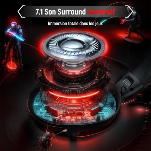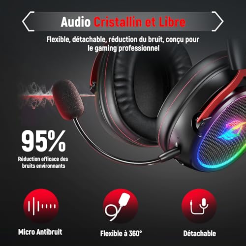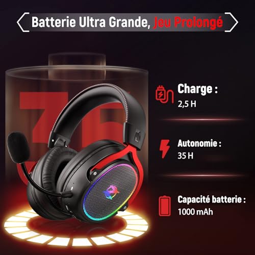 🕹️【Signature sonore riche- Idéale pour les jeux】 Offrez une expérience audio de jeu holistique avec des basses puissantes grâce aux haut-parleurs de 50 mm et au son surround 7.1. Que ce soit un jeu de tir à la première personne, un jeu de course ou un jeu de rôle, plongez dans l’action comme si vous y étiez. 🕹️【Clarté vocale améliorée pour le jeu avec puce ENC】 Le microphone à annulation de bruit environnemental capture des signaux indépendants et extrait votre voix du bruit ambiant environnant. Plus de voix craquées ou mélangées lorsque vous parlez dans le microphone. 🕹️【Ultra-faible latence pour une synchronisation audio-visuelle fluide】 Une latence ultra-faible inégalée pour une synchronisation audio-visuelle fluide, une transmission audio en temps réel et une précision sonore améliorée. Plongez dans le monde de la musique, des jeux et de la communication, en profitant de la commodité et du plaisir apportés par la liberté sans fil. 🕹️【Autonomie longue durée pour un plaisir de jeu prolongé】Avec une batterie puissante de 1000 mAh, nos casque gaming sans fil offrent jusqu’à 35 heures d’utilisation ininterrompue sans lumières. Activez le mode de lumière RGB captivant et profitez toujours de jusqu’à 25 heures de plaisir audio-visuel immersif. 🕹️【Conception confortable et durable】Avec un poids de 250g, les écouteurs de jeu assurent une expérience de port confortable, tandis que le cuir de confort premium élimine toute pression sur les oreilles. De plus, le bandeau est équipé de rembourrage en mousse pour réduire la pression sur la tête. ✨【Compatibilité polyvalente en 4 modes】 Le casque gamer offre des options de compatibilité flexibles pour répondre à vos besoins. Utilisez le mode Bluetooth, le double émetteur USB-A & USB-C, ou le mode filaire pour une connexion stable. ✨【Appareils compatibles avec le casque sans fil】 ①Adaptateur USB-A : PC, PS4, PS5, Ordinateurs Portables ②Adaptateur USB-C : Switch, Tablette, Smartphone ③Bluetooth : Smartphone, Tablette, Ordinateur Portable, TV, Switch ④ Prise filaire 3,5 mm : Compatible avec tous les appareils de jeu dotés d’une prise 3,5 mm