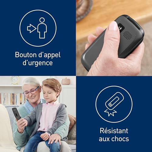 FACILE À UTILISER : le design à clapet, l’écran lumineux de 2,4 pouces et les grands boutons sont très intuitifs et ses fonctions sont très faciles à utiliser, parfait pour les personnes âgées RÉSISTANT AUX CHOCS : peut résister en toute sécurité à des chutes allant jusqu’à 1,5 mètre. Norme militaire MIL-STD-810G.516 COMPATIBLE AVEC LES APPAREILS AUDITIFS : Vous pouvez utiliser votre téléphone sans avoir à retirer votre appareil auditif et sans être interrompu par des interférences BATTERIE LONGUE DURÉE : Jusqu’à 600 heures d’autonomie en veille FONCTION LAMPE DE POCHE : LED intégrée comme lampe de poche, par exemple pour faciliter l’insertion des clés dans la serrure de la porte dans l’obscurité Attention : ce téléphone fonctionne uniquement sur les réseaux 2G. Veuillez vérifier que votre opérateur prend toujours en charge le réseau 2G avant utilisation. Les MMS ne sont pas pris en charge Attention : Ce téléphone fonctionne uniquement sur les réseaux 2G. Veuillez vérifier que votre opérateur prend toujours en charge le réseau 2G avant utilisation.