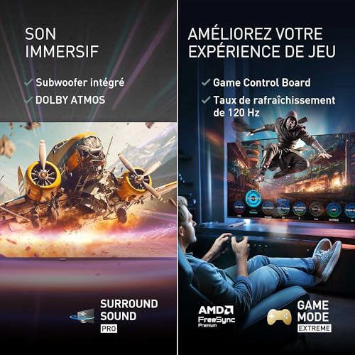 ÉCRAN QLED 4K : Profitez d’images exceptionnelles aux couleurs éclatantes grâce à la technologie QLED, au processeur HCX et au Bright Panel Plus sur ce téléviseur UHD 4K DOLBY VISION & MULTI HDR : Profitez de détails vifs et couleus vifs avec Dolby Vision, HDR10+ et HLG sur cette Smart TV OLED, garantissant le meilleur pour les films, les sports et les scènes d’action SON DOLBY ATMOS : Plongez dans un son cinéma avec ce téléviseur 4K Ultra HD, doté de la technologie Dolby Atmos et d’un woofer intégré, pour une expérience audio complète MODE JEU EXTREME : Améliorez vos jeux avec un taux de rafraîchissement de 120 Hz, VRR et AMD FreeSync Premium sur ce téléviseur UHD, en réduisant le décalage d’entrée pour un gameplay fluide MODE CINÉMA : Regardez des films tels que les réalisateurs les ont conçus sur ce téléviseur HDR, avec paramètres d’image et de mouvement optimisés FIRE TV & ALEXA : Profitez de vos programmes préférés sur Netflix, Prime Video, Disney+ ainsi que des fonctionnalités exclusives de Panasonic. Alexa peut également vous aider à créer l’ambiance idéale pour votre soirée cinéma. Appuyez simplement sur le bouton Alexa de votre télécommande et utilisez votre voix pour trouver de nouveaux contenus, et interagir avec vos appareils connectés. SUPPORT APPLE : Contrôlez votre télé 4K avec Apple AirPlay et Apple Home