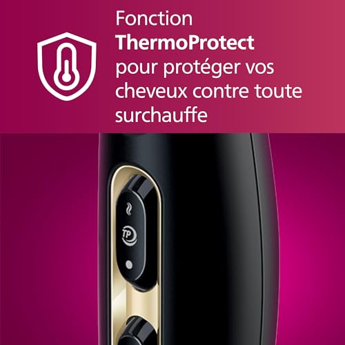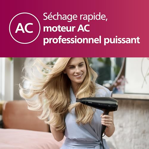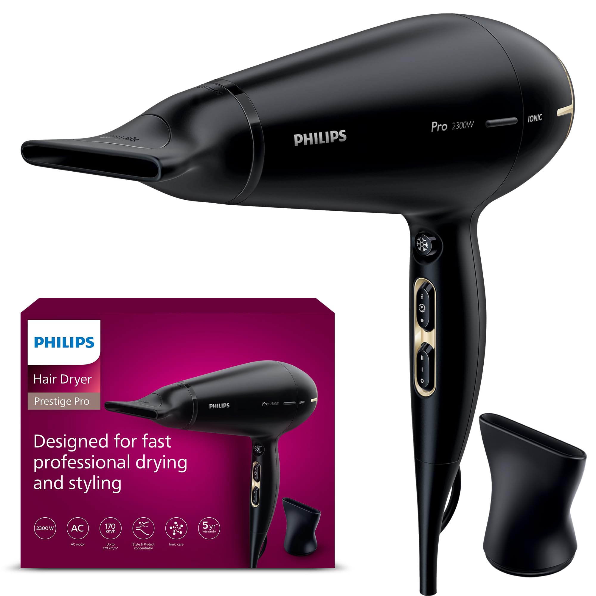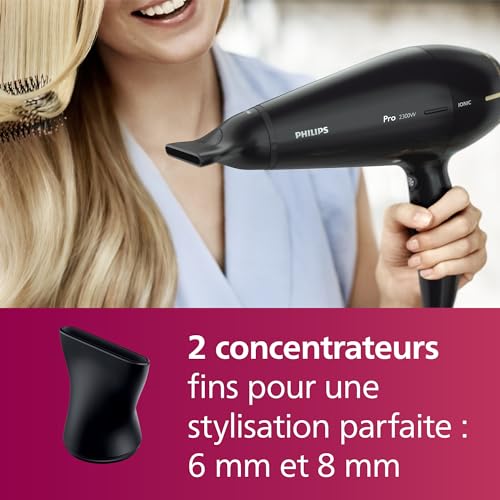 Le sèche-cheveux Philips Prestige Pro est équipé d’un moteur AC hautes performances produisant un flux d’air élevé pouvant atteindre 170 km/h¹, ce qui est 50 % plus rapide² ; il est conçu pour offrir des résultats professionnels et efficaces Ce sèche-cheveux de 2 300 W produit un flux d’air puissant : il combine puissance et vitesse pour vous permettre de sécher et styliser vos cheveux encore plus rapidement et facilement Avec le sèche-cheveux ionique Philips, vos cheveux sont brillants, lisses et sans frisottis : les ions négatifs éliminent l’électricité statique, préservent vos cheveux et lissent les cuticules afin d’intensifier leur brillance La fonction ThermoProtect assure une température de séchage idéale et protège vos cheveux contre la surchauffe ; le flux d’air ne perd pas en puissance et vous obtenez des résultats exceptionnels tout en préservant vos cheveux Des résultats impeccables avec un concentrateur pour tous les besoins : celui de 6 mm pour un brushing précis préservant vos cheveux au maximum, et celui de 8 mm pour une coiffure et des finitions impeccables