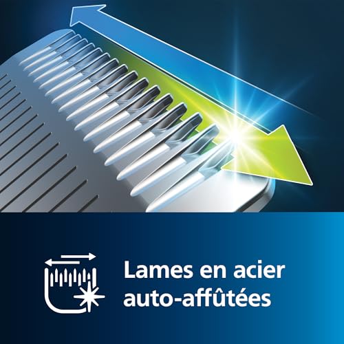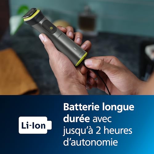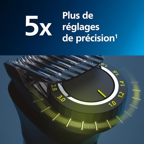 14 outils adaptés à tous vos besoins : rasage de la barbe, entretien des poils du corps, coupe des cheveux, taille des poils du nez/des oreilles/des sourcils. 21 hauteurs de coupe (de 0,5 à 16 mm) adaptées à tous les styles de barbes. Sabot de précision : profitez des 11 hauteurs de coupe (de 1 à 3 mm) par pas de 0,2 mm pour une coupe uniforme à la longueur de votre choix Lames en acier inoxydable auto-affûtées : vos lames restent affûtées comme au premier jour pour des performances durables. Pas besoin de lubrifier la lame. Technologie BeardSense : scanne la densité de la barbe 125 fois par seconde et augmente la puissance selon vos besoins pour tailler tout type de barbe. Batterie lithium-ion puissante : profitez de 120 minutes d’autonomie ainsi que d’une option de charge rapide de 5 minutes grâce au câble de recharge USB-A (adaptateur secteur non inclus).