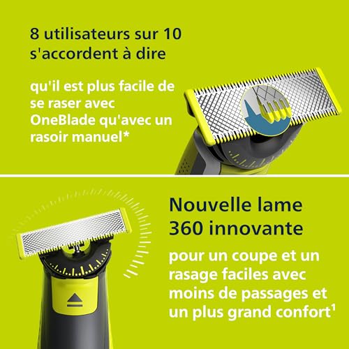 Technologie OneBlade : l’élément de coupe rapide (12 000 mouvements par minute) est efficace, même sur les poils longs ; le double système de protection avec revêtement lisse et bords arrondis facilite le rasage et le rend plus confortable Lame 360 innovante : pivote dans toutes les directions pour assurer une maîtrise et un contact avec la peau permanents ; taillez et rasez facilement les zones les plus difficiles d’accès, avec moins de passages et plus de confort¹ Conçu pour couper les poils et non la peau : coupez votre barbe de 3 jours à une hauteur régulière avec nos 3 sabots barbe de 3 jours (1, 3 et 5 mm), créez des contours précis grâce à la lame double sens et rasez facilement toutes les longueurs de poils Rasoir électrique 100 % étanche pour une utilisation facile en tout lieu : utilisez-le sous la douche sur peau sèche ou humide ; sa batterie Ni-MH offrant une autonomie de 45 minutes et son manche compact en font un compagnon de voyage idéal Ne s’émousse pas facilement : la lame en inox permet jusqu’à 4 mois d’utilisation pour maintenir une sensation de fraîcheur ; une icône de retrait apparaît sur la lame lorsqu’il est temps de la remplacer L’ensemble comprend : 1x Philips OneBlade 360, 2x lames 360, 3x peigne à barbe (1,3,5mm), 1x capuchon de rangement, 1x pochette souple, un manuel d’utilisation ; adaptateur électrique non inclus