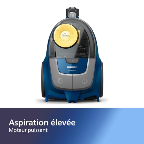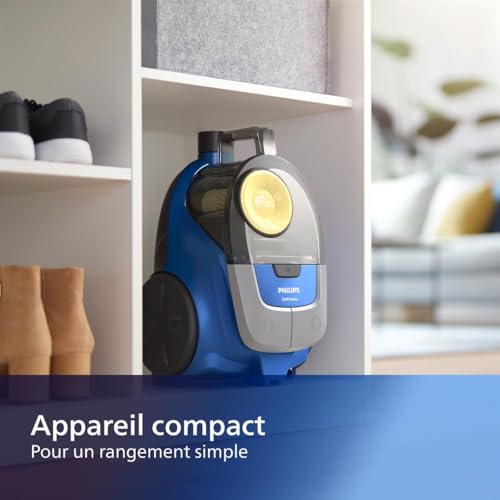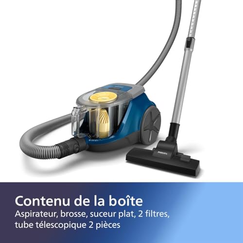 Haute puissance : aspirateur sans sac ultra-efficace Philips Série 2000 – Le moteur de 850 W offre une puissance d’aspiration élevée pour un nettoyage optimal Performances durables : la technologie PowerCyclone 4 accélère le débit d’air dans la chambre cylindrique garantissant plus de puissance, plus longtemps Facile à régler : utilisez la pédale de la brosse multi-usage pour changer de mode de nettoyage – Passez d’un nettoyage moquette idéal à un nettoyage de sols optimal Un air plus propre dans votre maison : le système de filtre Super Clean Air piège 99,9 %* des petites particules de poussière grâce à la brosse multi-usage et à la puissance d’aspiration élevée Contenu de la boîte : aspirateur, brosse multi-usage, suceur plat, filtre Super Clean Air, filtre lavable, tube télescopique métallique en 2 éléments