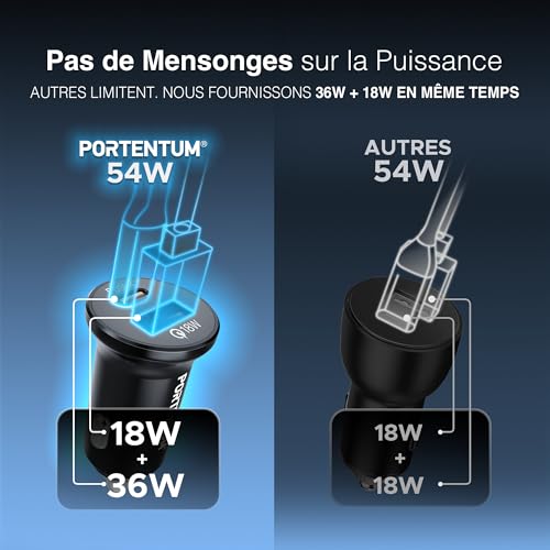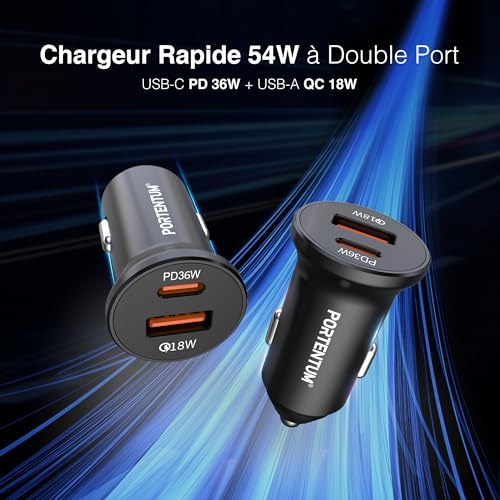 PORTENTUM Allume Cigare 54W + 60W Cable Rapide – Double Charger Voiture simultané réel – USBC PD 36W + USBA QC 18W – Prise Allume Cigare 12V pour iPhone iPad Android Smartphone