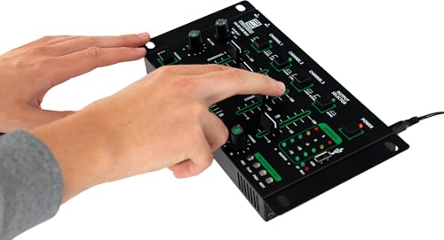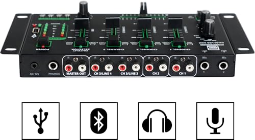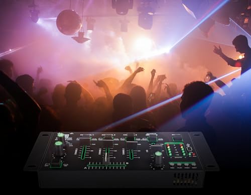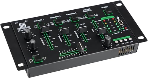 Mixeur DJ 4 canaux, lecteur MP3 pour clés USB, fonction pré-écoute pour tous les canaux, interface Bluetooth intégrée Faders 45 mm, construction robuste, 2x canal Line/Phono (Cinch) avec sensibilité d’entrée commutable 2x canal Line (Cinch), régulateur Cue Select pour sortie casque, 2x entrée micro avec réglage de niveau Fonction Talkover, sortie Master L/R (Cinch), affichage de niveau LED à 5 chiffres, poids : 790 g Dimensions boîtier (LxPxH) sans équerres de rack ni commandes : 222 x 129 x 28 mm, dimensions totales (LxPxH) : 267 x 136 x 51 mm