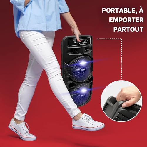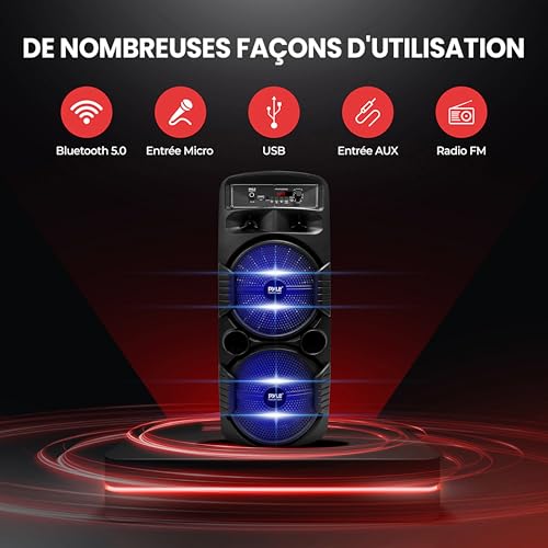 600 WATTS DE PUISSANCE : Cette enceinte Bluetooth portable haute puissance pour karaoké est équipée de deux caissons de basses de 20,32 cm et d’un tweeter de 2,5 cm, offrant une puissance maximale de 600 watts / 300W RMS à 2,6 ohms pour une reproduction sonore stéréo à gamme complète et une réponse impressionnante des basses. Étanche : Non COMPATIBLE AVEC BLUETOOTH : Le Haut Parleur Bluetooth portable est compatible avec Bluetooth pour la diffusion audio sans fil et fonctionne avec des appareils tels que l’iPhone, les téléphones mobiles Android, l’iPad, la tablette, le PC. Idéal pour une utilisation personnelle en intérieur et en extérieur. 3 ENTRÉES : Le Pyle Enceinte Bluetooth lumineuse est équipé d’un lecteur de clé USB pour qu’il puisse servir de lecteur MP3, d’une entrée AUX de 3,5 mm pour connecter des appareils externes et d’une entrée micro/guitare de 0,64 cm. Équipé d’une radio FM avec affichage numérique à LED. LUMIÈRES DJ CLIGNOTANTES : L’enceinte karaoke dispose de lumières de fête LED disco clignotantes multicolores. Cette enceinte amplifiée sans fil ajoute de la vie à n’importe quelle occasion, idéal pour les fêtes sur la terrasse et les réunions nocturnes où la présence colorée est remarquable. BATTERIE RECHARGEABLE : Cette Enceinte Portable Bluetooth est idéale pour le karaoké, les performances sur scène et la gestion de foule. Elle est entièrement portable grâce à sa batterie rechargeable intégrée avec des indicateurs lumineux de niveau et une poignée de transport extensible, ce qui vous permet de l’emporter partout