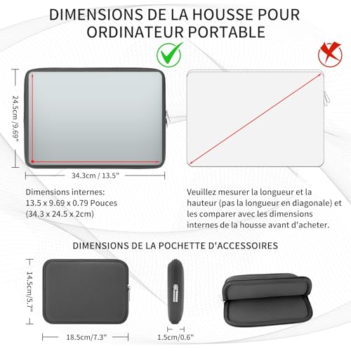 TAILLE ET MODèLE APPLICABLES: Le housse 14 pouces est un modèle universel pour la plupart des ordinateur portable/tablette/Chromebook de 14 pouces. Notez que nous recommandons la housse 13-13,3 pouces pour le 14″ MacBook A2442. Dimensions externes: 35,5 x 26,5 x 2 cm(13,98 x 10,43 x 0,8 pouces). Dimensions internes: 34,3 x 24,6 x 2 cm(13,5 x 9,69 x 0,79 pouces). Si vous avez particulièrement besoin d’un ajustement serré ou ample, vérifiez les dimensions réelles de votre ordinateur portable avant de l’acheter, car la taille des différents modèles et marques variera. PROTECTION DE BASE: En tant que housse intérieure, la couche extérieure est recouverte de tissu polyester, et la couche intérieure est rembourrée avec un EPE à haute résilience, protège contre la poussière, les débris de calcaire, les rayures, offre une protection contre les chocs, les secousses et l’extrusion lorsqu’il est mis dans un sac à dos ou une valise. FERMETURE À glissière LISSE: La fermeture à glissière à chargement par le haut assure que la pochette pour ordinateur portable restera fermée, en douceur et protégera parfaitement le contenu à l’intérieur. ACCOMPAGNÉ DE PETITES MANCHES SPÉCIALISÉES: Petite pochette spécialisée pour chargeur d’alimentation et étui à souris, coupe slim portable et légère pour un usage quotidien. S’il vous plaît attention! Pour choisir la bonne taille dont vous avez besoin, veuillez lire attentivement les instructions suivantes dans la description du produit avant de commander. Si vous avez des inquiétudes concernant les dimensions, n’hésitez pas à nous contacter.