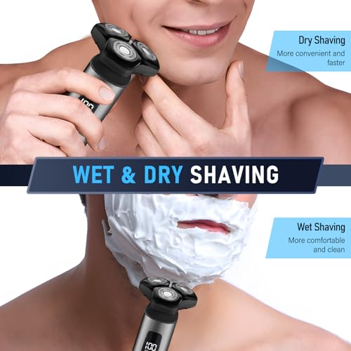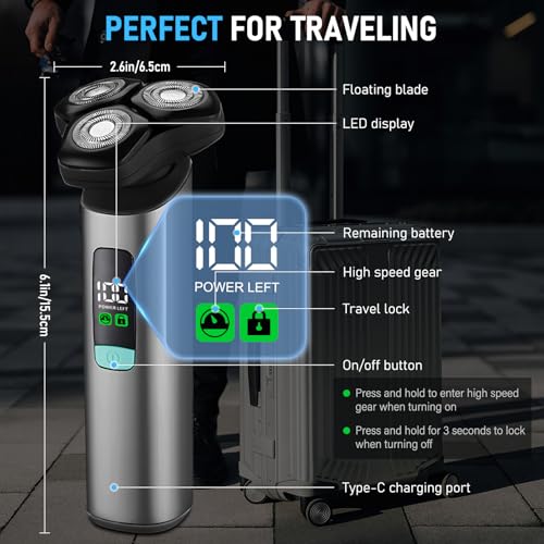 【Ensemble de rasoir électrique 4 en 1】Ce rasoir électrique multifonction pour homme comprend divers accessoires : tondeuse à poils de nez, brosse de nettoyage et tondeuse à cheveux, pour répondre à vos besoins de rasage du visage et du corps. Il est équipé d’une tête de lame flottante 3D qui épouse parfaitement les contours du visage, du cou et même de la mâchoire, pour un rasage rapide et précis. 【Lame magnétique et étanchéité IPX7】Ce Rasoir Electrique est doté d’une tête de lame magnétique amovible, facile à retirer et à laver. L’indice d’étanchéité IPX7 permet un lavage complet du corps. Que vous utilisiez de la mousse, du gel ou que vous l’utilisiez sous la douche, il répond à tous vos besoins. 【Affichage LED et 2 vitesses】Ce rasoir électrique pour homme est équipé d’un écran LED pour un affichage clair de la charge de la batterie. Il dispose également d’une fonction d’accélération intelligente. Après la mise sous tension, l’appareil passe automatiquement en vitesse rapide lorsque le courant augmente, ou vous pouvez appuyer longuement sur le bouton d’alimentation pour passer en vitesse supérieure. 【Charge rapide Type-C】Ce rasoir électrique pour homme est équipé d’une batterie lithium-ion grande capacité de 1200 mAh et d’une interface de charge rapide Type-C. Il se recharge complètement en 3 heures et offre une autonomie allant jusqu’à 180 minutes. Le chargement USB-C est compatible avec de nombreux appareils : adaptateurs secteur, blocs d’alimentation mobiles, chargeurs de voiture et ordinateurs. 【Verrouillage de voyage et portable】Ce rasoir électrique pour homme est équipé d’un verrouillage de voyage : lorsqu’il est éteint, maintenez le bouton d’alimentation enfoncé pendant 3 secondes pour le verrouiller en toute sécurité. Vous n’avez donc pas à craindre de le mettre en marche accidentellement pendant vos déplacements. Sans fil et facile à transporter, ce rasoir électrique pour homme est idéal pour les voyages d’affaires.