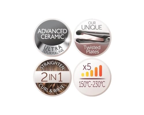 Revêtement en céramique avancée, tourmaline, antistatique pour des cheveux brillants et sans frisottis Design Twist unique pour créer des boucles volumineuses, des ondulations naturelles ou pour des cheveux ultra lisses Plaques longues pour attraper un maximum de cheveux en un seul passage Température modulable (150 à 230°C) – Ecran digital…