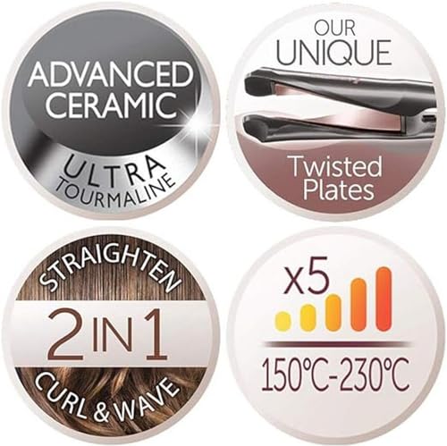 Produit coiffant 2 en 1 pour lisser, boucler et onduler Revêtement en céramique de haute qualité enrichi en tourmaline antistatique pour une glisse fluide dans les cheveux et une réduction de la charge statique sur les cheveux Affichage numérique avec cinq réglages de température de 150 à 230 C, temps de préchauffage de 30 secondes, fonction d’augmentation de la température vous permettant de régler rapidement la température maximale Nos plaques de coiffage incurvées et élastiques uniques permettent de lisser et de coiffer facilement les boucles et les ondulations en une seule fois Interrupteur interne marche/arrêt pour éviter toute utilisation accidentelle pendant le coiffage Chaque fois que vous utilisez l’appareil, la dernière température sélectionnée est automatiquement réglée