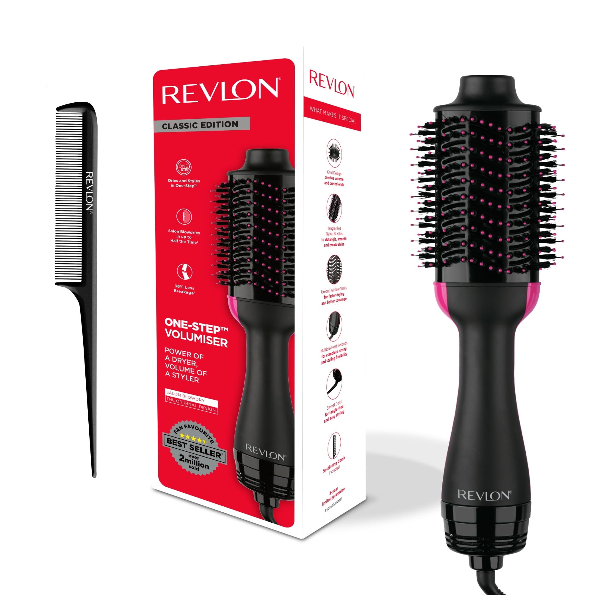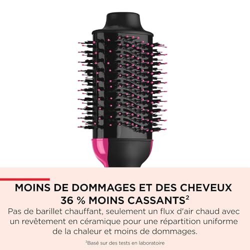 Vous méritez un brushing qualité salon sans abîmer vos cheveux ni votre porte-monnaie – L’outil de coiffure 2 en 1 best seller qui offre la puissance d’un sèche-cheveux et le volume d’une brosse coiffante pour obtenir un brushing qualité salon à la maison La brosse ovale Revlon Originale glisse dans vos cheveux pour les démêler, les sécher et leur donner du volume jusqu’à deux fois plus rapidement(1) – Pour donner du volume aux racines et des longueurs bouclées 30 % de frisottis en moins et plus de brillance grâce à la technologie ionique Tourmaline, votre arme secrète pour des cheveux brillants et en bonne santé 36 % moins de casse et moins de dommages dus à la chaleur – Coiffez vos cheveux uniquement avec de l’air chaud pour qu’ils soient moins abîmés et en meilleure santé – Le revêtement en céramique assure une répartition uniforme de la chaleur et réduit les dommages