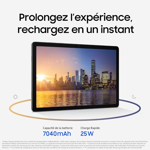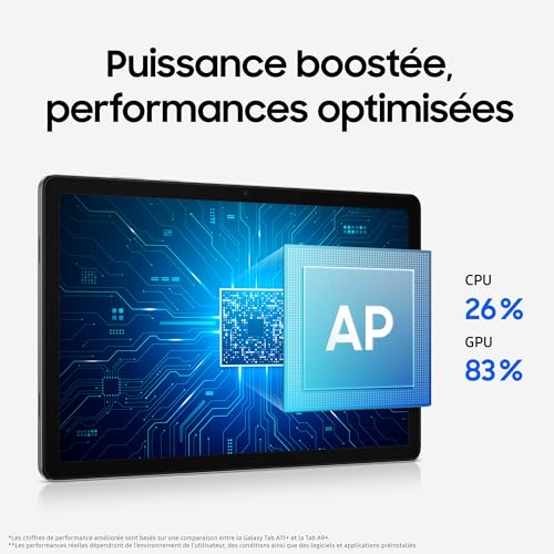 MODERNE, FINE ET PUISSANTE : La Galaxy Tab A11+ au design haut de gamme et à la silhouette épurée est dotée de processeurs optimisés pour des performances toujours optimales, que ce soit pour le travail ou les loisirs, sans interruption.¹ ² ³ VOTRE CONSEILLER GEMINI : Activez la fonction Live et partagez votre caméra avec Gemini pour obtenir de l’aide sur votre environnement. Partagez votre écran et engagez une conversation fluide qui vous aidera à obtenir les réponses dont vous avez besoin.⁴ PLUS DE STOCKAGE ET UNE MEILLEURE AUTONOMIE : La Galaxy Tab A11+ offre jusqu’à 6 Go de mémoire et 128 Go de stockage, ce qui est idéal pour le multitâche. Grâce à la recharge ultra rapide de 25W, profitez d’une utilisation pratique et prolongée.⁵ ⁶ ⁷ ⁸ ⁹ ¹⁰ ¹¹ ¹² ¹³ CHAQUE DÉTAIL COMPTE : Optimisez vos divertissements grâce à l’affichage fluide et au taux de rafraîchissement de 90 Hz. La caméra frontale de 5 MP vous permet de passer des appels vidéo plus nets pour donner à chaque sourire plus de réalisme.¹⁴ ¹⁵ ¹⁶ ¹⁷ UNE EXPÉRIENCE IMMERSIVE : La Galaxy Tab A11+ est équipée de haut-parleurs compatibles Dolby Atmos pour une expérience sonore riche. Elle possède également une prise audio jack de 3,5mm pour que vous puissiez connecter vos écouteurs filaires.¹⁸ ¹⁹