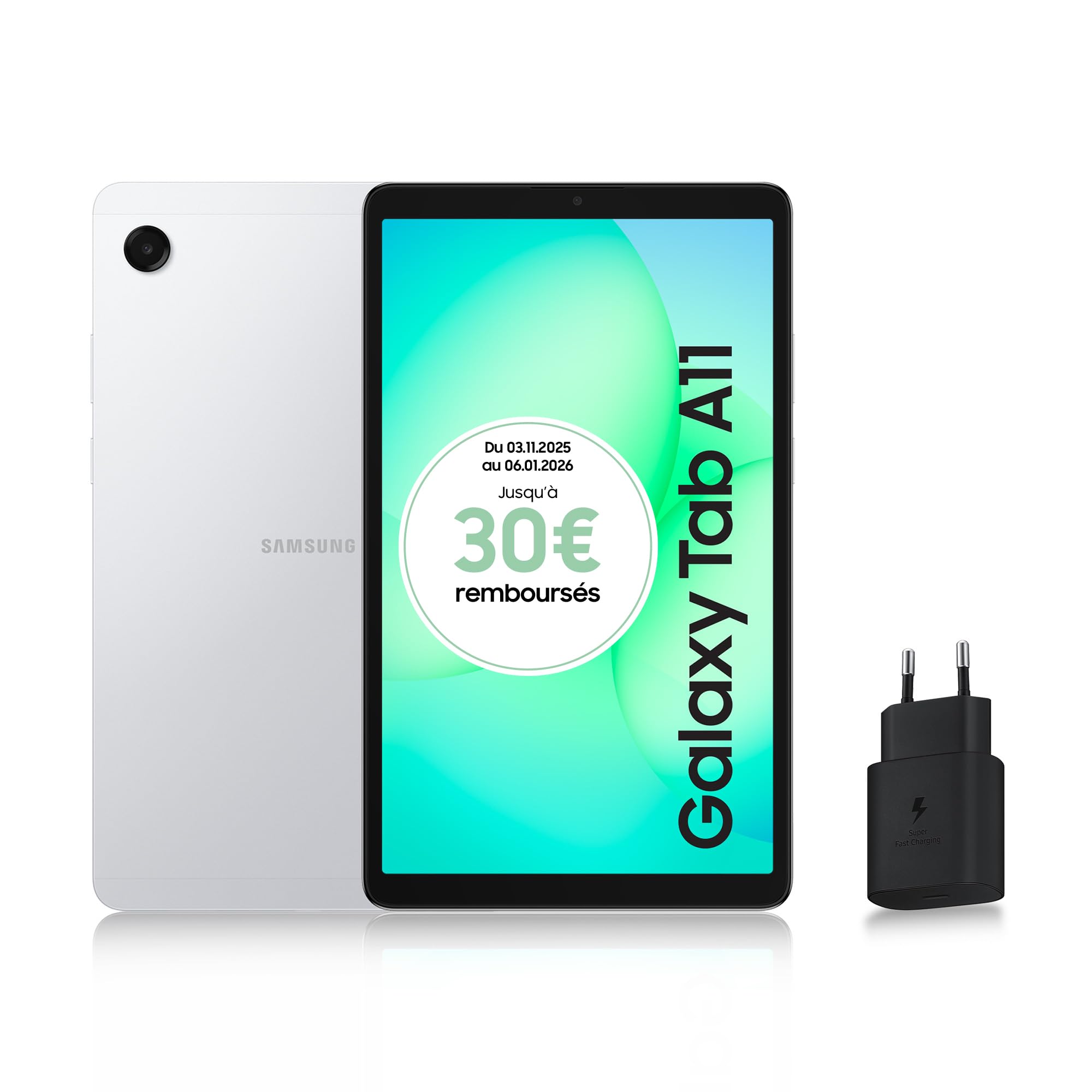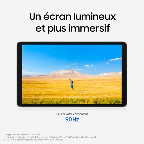 DESIGN MODERNE, FIN ET ÉPURÉ : Inspiré du design signature des Galaxy S Series, la Galaxy Tab A11 arbore un design moderne et élégant. Disponible en 2 couleurs, elle s’harmonisera avec votre style au quotidien.¹ ÉCRAN LUMINEUX ET IMMERSIF : Profitez de l’écran clair et lumineux ainsi que du taux de rafraîchissement de 90 Hz de la Galaxy Tab A11. Grâce à sa luminosité améliorée profitez de vos divertissements préférés même en plein soleil.² ³ ⁴ VOS SOUVENIRS À PORTÉE DE MAIN : La Galaxy Tab A11 offre jusqu’à 8 Go de mémoire et 128 Go de stockage, idéal pour le multitâche. Si vous souhaitez étendre encore plus le stockage, vous pouvez y insérer une carte microSD jusqu’à 2 To.² ⁵ ⁶ ⁷ ⁸ CHAQUE DÉTAIL COMPTE : Grâce à la caméra frontale de 5MP de la Galaxy Tab A11, passez des appels vidéos plus clairs et plus nets, que ce soit pour donner de vos nouvelles à votre famille ou pour travailler avec vos collègues.⁹ UNE EXPÉRIENCE AUDIO IMMERSIVE : La Galaxy Tab A11 comprend des hauts-parleurs compatibles Dolby Atmos pour une expérience sonore riche. Elle possède également une prise audio jack de 3,5mm pour que vous puissiez connecter vos écouteurs filaires.² ¹⁰
