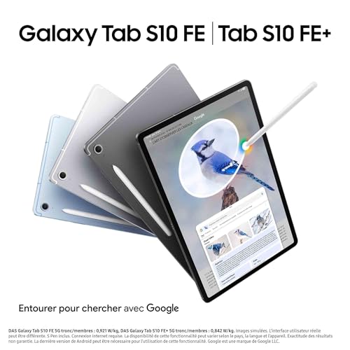 Design iconique : Dotées d’un S Pen et d’un design ultra-fin, léger et résistant, les Galaxy Tab S10 FE et Tab S10 FE+ s’intégrent parfaitement à votre quotidien. Disponibles en Gris Anthracite, Argent et Bleu. ¹ Recherches simplifiées : Entourez, surlignez ou appuyez sur n’importe quelle image, vidéo ou texte à l’écran pour faire une recherche rapide grâce à Entourer pour chercher avec Google. Plus besoin de faire de captures d’écran ! ² Prêt pour l’aventure : Emportez l’écran 10,9″ de la tablette Tab S10 FE partout avec vous ou visez encore plus grand avec l’écran 13,1″ de la tablette Tab S10 FE+, certifiées IP68 pour résister à l’eau et à la poussière. ³ ¹⁰ Performance : Créez, travaillez et jouez grâce au processeur optimisé par l’IA. Passez d’un projet à un autre en toute fluidité, naviguez sans accroc et augmentez l’espace de stockage jusqu’à 2 To avec une carte microSD.⁹ ¹⁰ Fonctionnalités intelligentes : Appuyez sur la touche étoilée de votre Book Cover Keyboard (vendu séparément) pour accéder aux fonctionnalités IA et configurer votre assistant. Des difficultés en maths ? Écrivez l’équation avec le S Pen et le calculateur mathématique la résoudra pour vous. ¹¹ ¹²