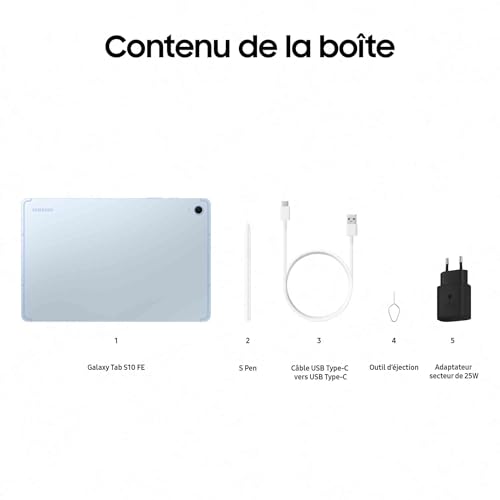 Design iconique : Dotées d’un S Pen et d’un design ultra-fin, léger et résistant, les Galaxy Tab S10 FE et Tab S10 FE+ s’intégrent parfaitement à votre quotidien. Disponibles en Gris Anthracite, Argent et Bleu. ¹ Recherches simplifiées : Entourez, surlignez ou appuyez sur n’importe quelle image, vidéo ou texte à l’écran pour faire une recherche rapide grâce à Entourer pour chercher avec Google. Plus besoin de faire de captures d’écran ! ² Prêt pour l’aventure : Emportez l’écran 10,9″ de la tablette Tab S10 FE partout avec vous ou visez encore plus grand avec l’écran 13,1″ de la tablette Tab S10 FE+, certifiées IP68 pour résister à l’eau et à la poussière. ³ ¹⁰ Performance : Créez, travaillez et jouez grâce au processeur optimisé par l’IA. Passez d’un projet à un autre en toute fluidité, naviguez sans accroc et augmentez l’espace de stockage jusqu’à 2 To avec une carte microSD.⁹ ¹⁰ Fonctionnalités intelligentes : Appuyez sur la touche étoilée de votre Book Cover Keyboard (vendu séparément) pour accéder aux fonctionnalités IA et configurer votre assistant. Des difficultés en maths ? Écrivez l’équation avec le S Pen et le calculateur mathématique la résoudra pour vous. ¹¹ ¹²