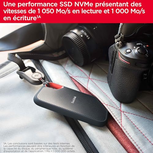 Bénéficiez des performances de la technologie SSD NVMe avec des vitesses de lecture et d’écriture pouvant atteindre respectivement 1050 Mo/s et 1000 Mo/s dans un disque portable haute capacité, parfait pour créer du contenu incroyable ou capturer des images exceptionnelles. Grâce à une protection contre les chutes allant jusqu’à trois mètres et à une résistance à l’eau et à la poussière (IP65), ce disque robuste supporte les aléas de la vie. Voyagez sans souci grâce à une garantie limitée de 5 ans et une coque résistante en silicone, qui offre un toucher de qualité supérieure et une protection supplémentaire à la partie extérieure du disque. Pour une plus grande tranquillité d’esprit, utilisez le mousqueton pratique pour le fixer à votre boucle de ceinture ou à votre sac à dos. Aide à garantir la confidentialité de votre contenu privé grâce à la protection par mot de passe intégrée, dotée du chiffrement matériel AES 256 bits. La protection par mot de passe utilise un chiffrement AES de 256 bits et est compatible avec Windows 8, Windows 10 et macOS 10.9 ou plus récent. Gérez facilement les fichiers et libérez automatiquement de l’espace grâce à l’application Memory Zone de SanDisk.