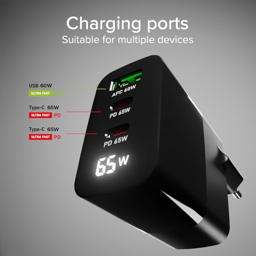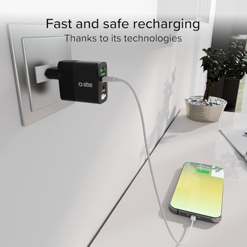 RECHARGE RAPIDE : le chargeur mural 65 W Power Control est parfait pour alimenter les smartphones, tablettes, enceintes, écouteurs et ordinateurs portables ; le chargeur Power Control dispose de trois sorties pour recharger jusqu’à trois appareils simultanément : 2x USB-C 65 W (PD) et 1x USB-A 60 W (AFC) ÉCRAN LCD : ce chargeur USB multiple vous permet de surveiller facilement la progression de la recharge et de toujours contrôler les performances de l’appareil grâce à l’écran LCD qui affiche en temps réel la puissance fournie pendant la recharge POWER DELIVERY (PD) : cet accessoire pour smartphone peut alimenter les appareils connectés avec une puissance supérieure ; dès que vous insérez votre câble compatible dans le port USB-C, le chargeur fournit une puissance de 65 watts, ce qui permet de recharger un smartphone en 15 minutes, une tablette en 30 minutes et un ordinateur portable en 50 minutes (les temps de recharge sont indicatifs et dépendent de la capacité de la batterie de l’appareil en cours de recharge) SÉCURITÉ : les produits équipés de la technologie Power Delivery sont conçus pour communiquer directement avec l’appareil afin de contrôler la quantité d’énergie à fournir ; ainsi, les surchauffes et les courts-circuits sont toujours évités. ADAPTIVE FAST CHARGE (AFC) : la sortie USB-A est équipée de la technologie Adaptive Fast Charge, qui ajuste automatiquement la puissance de sortie pour offrir la meilleure vitesse de charge possible, en fonction des capacités de l’appareil connecté.