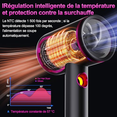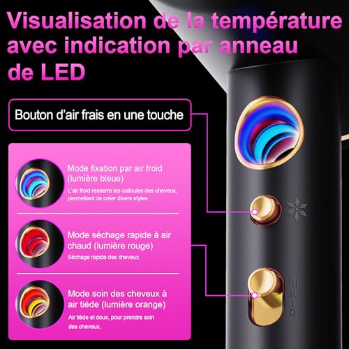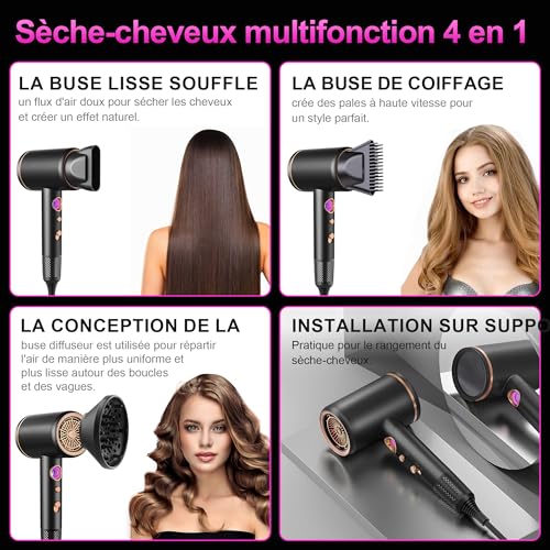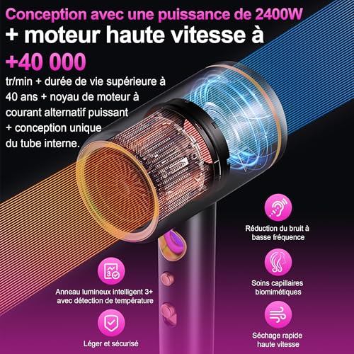 Ce sèche-cheveux utilise une puissance ultra forte de 2400 W pour un séchage rapide, une haute concentration d’ions négatis parfumés, un contrôle intelligent de la température qui ne nuit pas aux cheveux. Comprend 3 réglages de vitesse + mode IA intelligent, soin des cheveux avec des milliards d’ions négatifs, séchage rapide et coiffant, effet lisse et sans frisottis, moteur importé à grande vitesse avec 40 000 tr/min, réduction du bruit à basse fréquence, soin biomimétique des cheveux et ouverture intelligente pour le capteur de température 3+. Ce sèche-cheveux se trouve constamment en tête des ventes, grâce à la technologie de double flux d’air, au moteur de 40 000 tours par minute, à des vents puissants de 22 mètres par seconde et à une durée de vie de plus de 3000 heures. Dispose d’un anneau lumineux LED pour l’indication, de différentes températures de l’air pour répondre aux besoins de toutes les saisons, d’un interrupteur galvanique de haute qualité et d’une durée de vie plus longue. Ce sèche-cheveux dispose d’une protection intelligente à température constante pour prendre soin de vos cheveux. Le capteur NTC effectue 1500 mesures par seconde, et dès que la température de l’air dépasse 100°, le câble chauffant s’éteint immédiatement, préservant la nutrition, la douceur et la brillance de vos cheveux. La conception à double filtre résout efficacement le problème d’aspiration des cheveux sur la grille arrière. Ce sèche-cheveux utilise une technologie ultra-silencieuse et les moteurs avancés peuvent réduire considérablement le niveau de bruit, améliorant le confort d’utilisation et créant un environnement plus calme et plus sain. Choix entre différents modes : ce sèche-cheveux propose deux modes, chaud et froid. Chaque mode dispose de trois niveaux réglables, offrant une expérience de séchage multifonctionnelle et rapide pour chaque saison. Pour un coiffage rapide, le mode air froid en été offre fraîcheur et stabilité ; en hiver, le mode air chaud permet un séchage rapide et chaleureux ; tandis qu’en printemps et automne, le mode air chaud protège doucement les cheveux. Répond à tous vos besoins. Plusieurs combinaisons d’accessoires en mode combiné 4 en 1, buse concentratrice : cette buse peut être utilisée pour concentrer le flux d’air, augmenter la puissance du vent et la chaleur du sèche-cheveux et faciliter le coiffage précis. Le diffuseur répartit uniformément le flux d’air, réduit les dommages thermiques aux cheveux et augmente le volume et la définition des cheveux bouclés. Le peigne peut démêler les cheveux et facilite l’entretien, avec des crochets haute résistance pour un rangement facile.