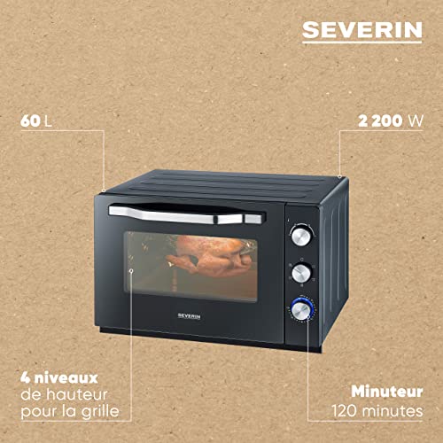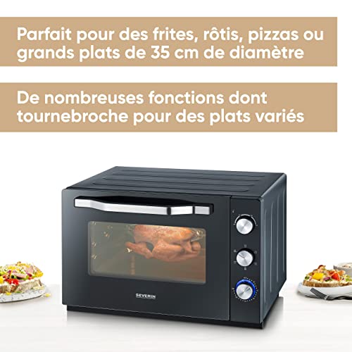 SEVERIN Four posable XXL à Chaleur Tournante 60 L avec pierre à pizza et tournebroche 2 200 W design simple et élégant, Four électrique avec minuteur 120 min, Noir/Inox, TO 2073